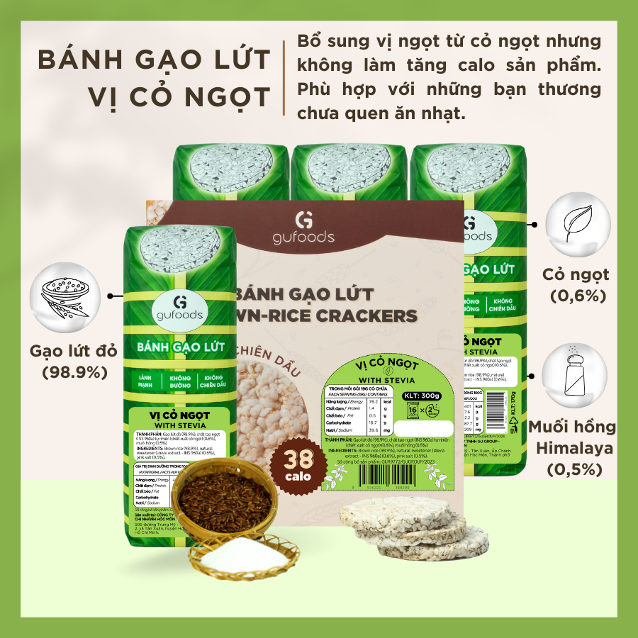 Bánh gạo lứt GUfoods vị Cỏ ngọt là sự kết hợp giữa hạt gạo lứt Việt Nam giàu chất xơ và công nghệ ép thuỷ lực hiện đại, giúp giữ trọn tối đa giá trị dinh dưỡng của gạo lứt. Bánh có vị ngọt nhẹ từ cỏ ngọt tự nhiên, phù hợp với những bạn thương chưa quen ăn nhạt, dễ ăn mà không lo nạp quá nhiều đường vào cơ thể.