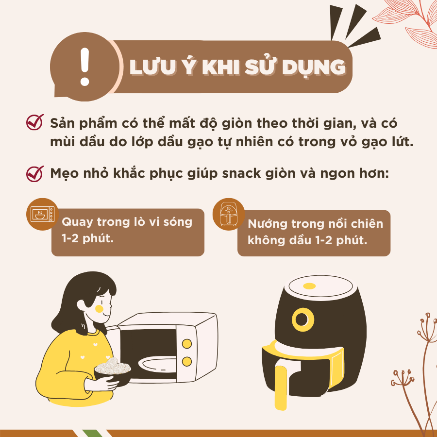 ✓ Sản phẩm có thể mất độ giòn theo thời gian, và có mùi dầu do lớp dầu gạo tự nhiên có trong vỏ gạo lứt, có thể khắc phục bằng cách quay trong lò vi sóng hoặc nồi chiên không dầu trong 1-2 phút
