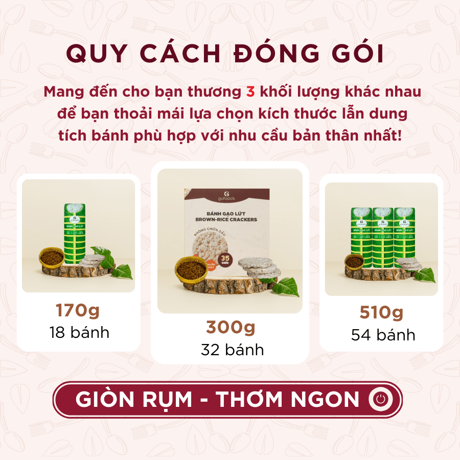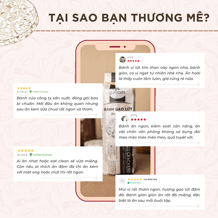 Với thành phần lành tính, tự nhiên, bạn thương có thể yên tâm sử dụng bánh gạo lứt cho hành trình sống xanh ăn lành của mình. Mật độ calo thấp, chỉ có 38 calo cho mỗi chiếc bánh với thể tích lớn, và phải nhai kỹ trước khi nuốt nên bánh gạo lứt GUfoods là lựa chọn lý tưởng để nhâm nhi như một món ăn vặt healthy lúc buồn chán, căng thẳng, hay khi cơn thèm ăn vặt bất thình lình ập tới.
