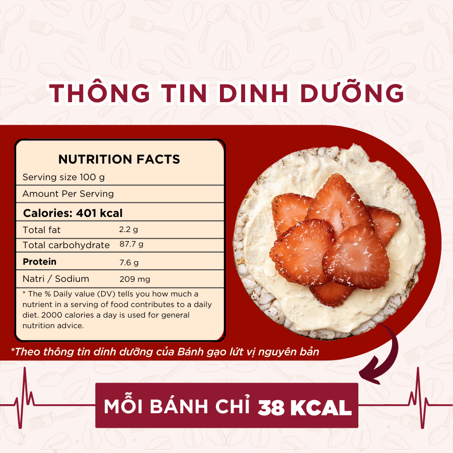 Mỗi chiếc bánh gạo lứt chứa khoảng 38 calo, kích thước đồng đều giúp bạn thương dễ dàng đo lường lượng calo nạp vào cơ thể mỗi ngày. Ngoài gói 170g gồm 18 bánh, bạn thương còn có thể chọn cho mình loại hộp với nhiều gói nhỏ 4 bánh tiện lợi, dễ dàng chia khẩu phần và mang theo khi đi tập, đi học, đi làm, đi dã ngoại...