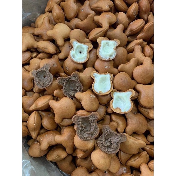 👉Bánh gấu kem béo (vàng): Vẫn là hương vị truyền thống của tuổi thơ với thành phần từ bột mì, đường sữa. Lớp bánh giòn bùi thơm phức, nhân kem ngọt béo.