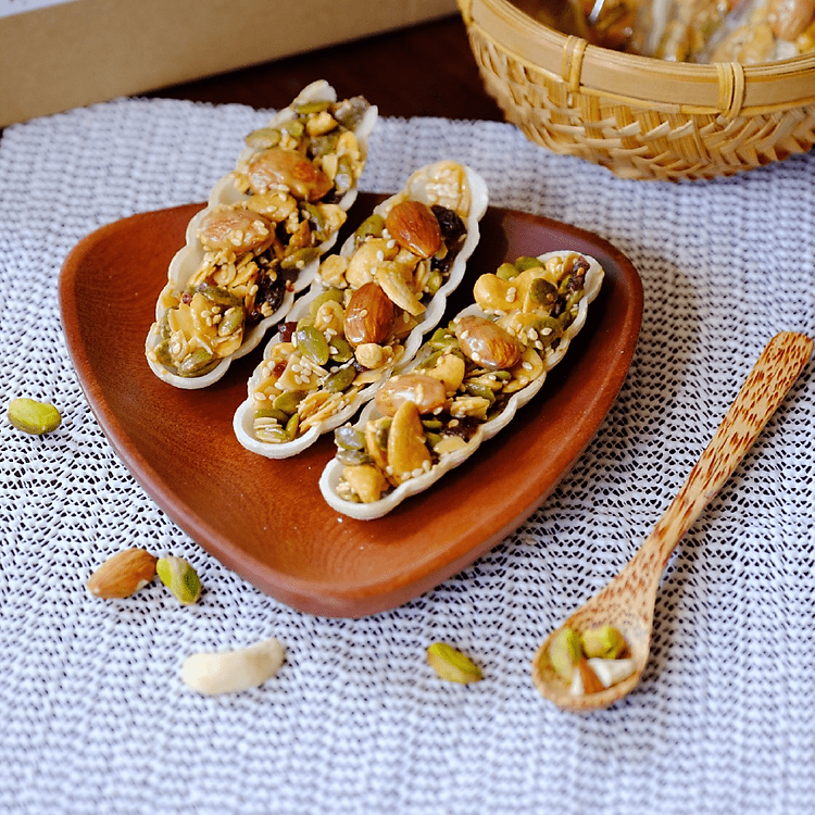 Mô tả sản phẩm: Đây là sản phẩm bánh thuyền mix hạt được Tân Lộc Phát sản xuất, kết hợp giữa hương vị ngọt dịu của bánh thuyền và độ giòn của các loại hạt. Bánh được làm từ các loại hạt như hạt bí ngô, hạt hạnh nhân, hạt dẻ cười kết hợp với ngũ cốc, tạo nên một trải nghiệm ẩm thực độc đáo và bổ dưỡng.