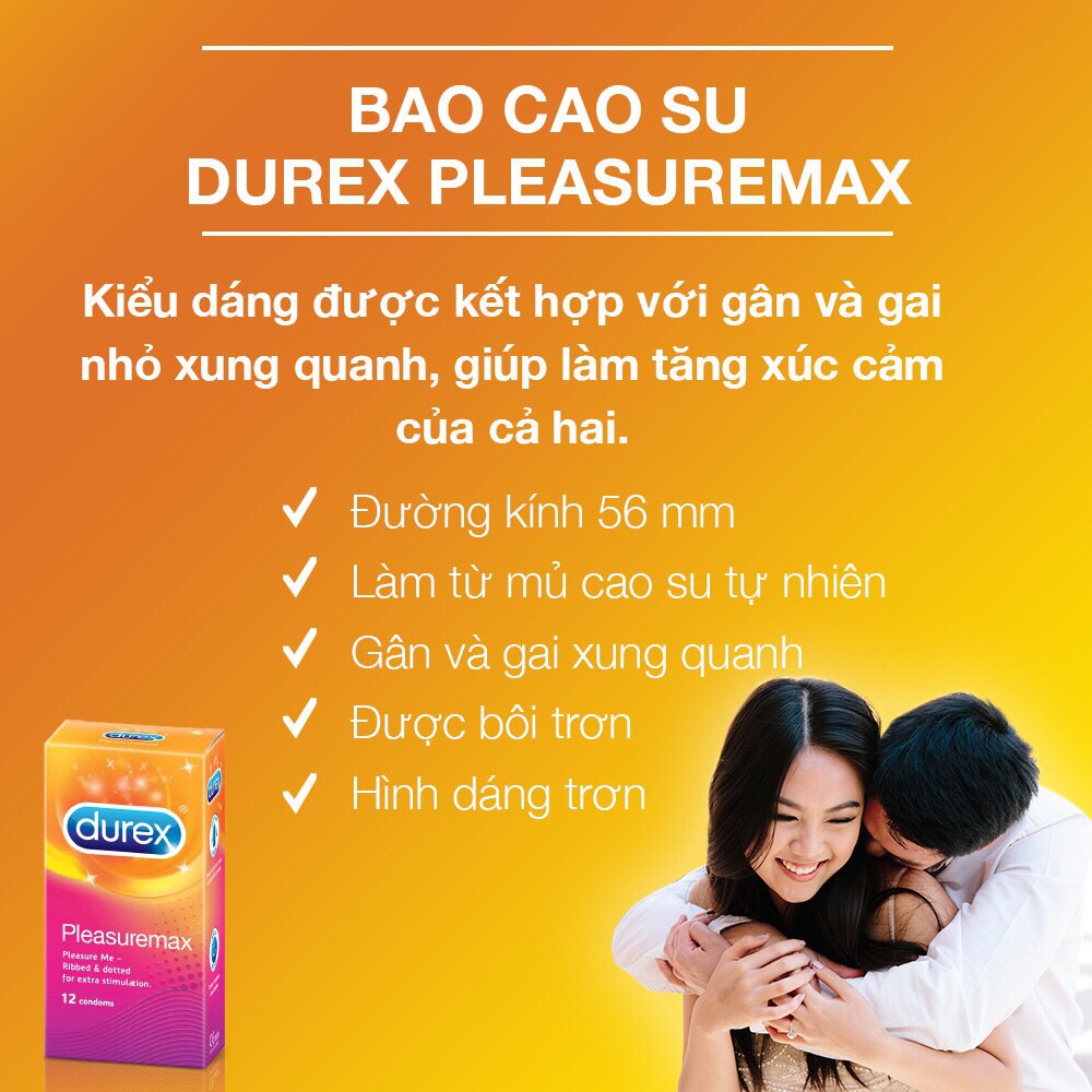 Bao cao su kéo dài thời gian quan hệ Durex Pleasuremax gân gai được thiết kế đặc biệt để giúp kéo dài cuộc yêu. Pleasuremax chứa Benzocain 5%, gây tê nhẹ, giúp trì hoãn cực khoái và kéo dài thời gian cương cứng, cho bạn điều khiển cuộc yêu theo cách của riêng mình. Bao cao su kéo dài thời gian quan hệ gân gai phát sángDurex là bí quyết tuyệt vời để giữ lửa cuộc yêu.