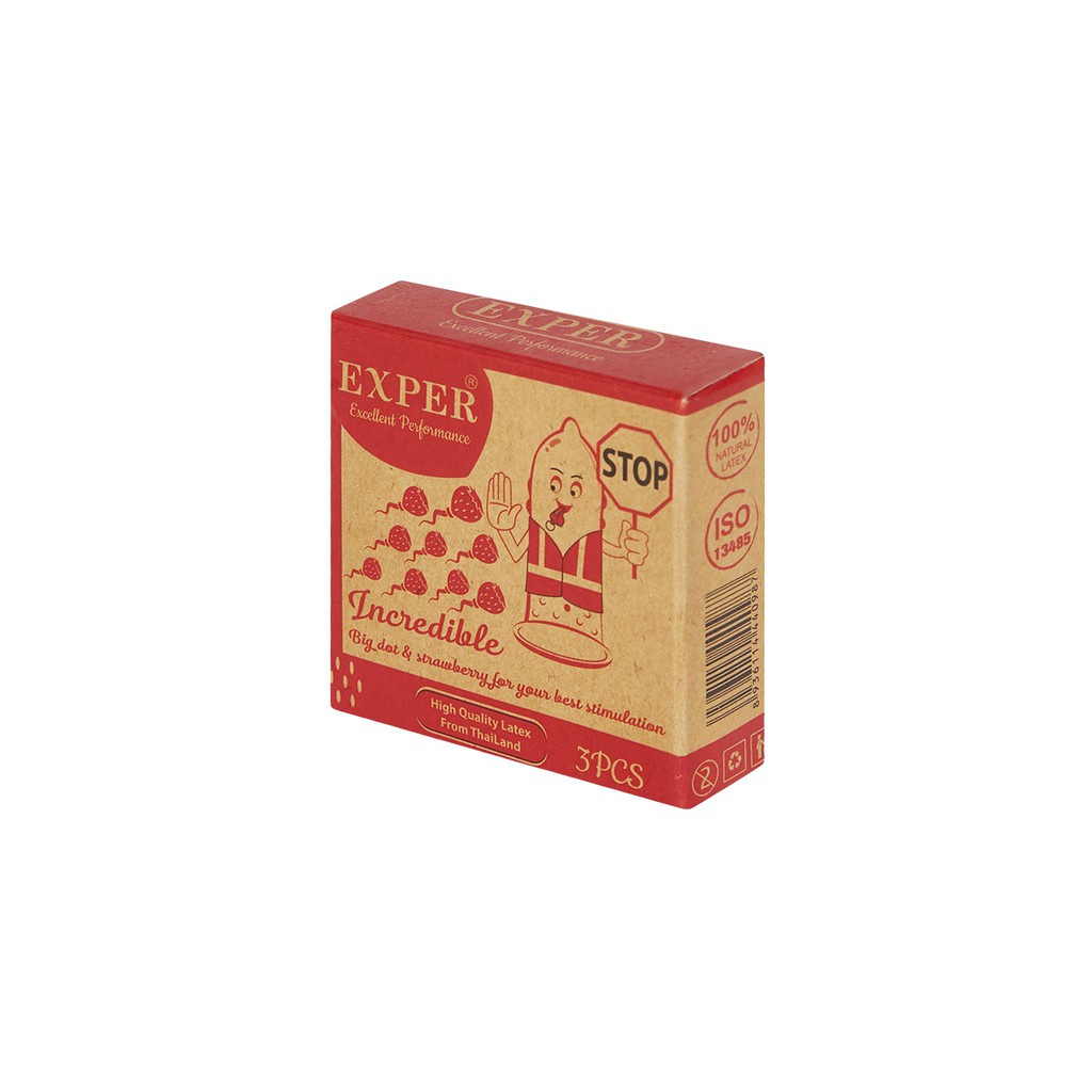 - Bao cao su với gần 400 hạt nổi, gai chạy dọc toàn thân giúp tăng khoái cảm cao độ. - Bao cao su với nguồn gốc latex/ mủ cao su cao cấp nhất được nhập khẩu từ Thái Lan. - Bao cao su trắng mịn, mượt mà với nhiều dầu bơi trơn cao cấp. - Bao cao su có hương dâu tự nhiên thơm dịu, vừa át được mùi cao su, vừa tạo những cảm giác ngọt ngào. - Bao cao su EXPER Incredible gai hương dâu đạt những tiêu chuẩn chất lượng rất cao là Iso 13485:2016 và Iso 4074:2014. Sản phẩm bao cao su Exper đã được cấp giấy lưu hành đúng theo quy định của Bộ y tế, chứng minh chất lượng sản phẩm cao cấp. - Sản phẩm bao cao su Exper Incredible có 2 quy cách đóng gói để lựa chọn: hộp 3 bsc và hộp 12 bcs.