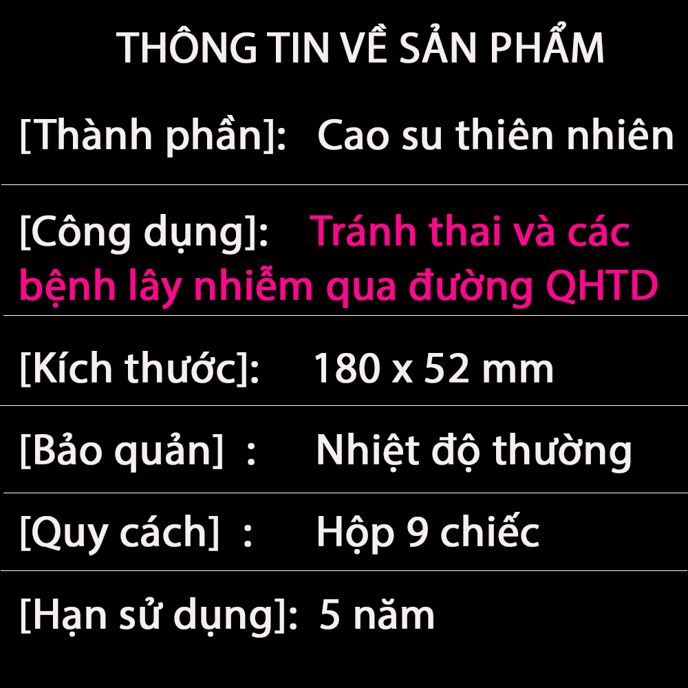 - Thành phần: 100% cao su tự nhiên, gel bôi trơn > 400mg, 9,6 % benzocain