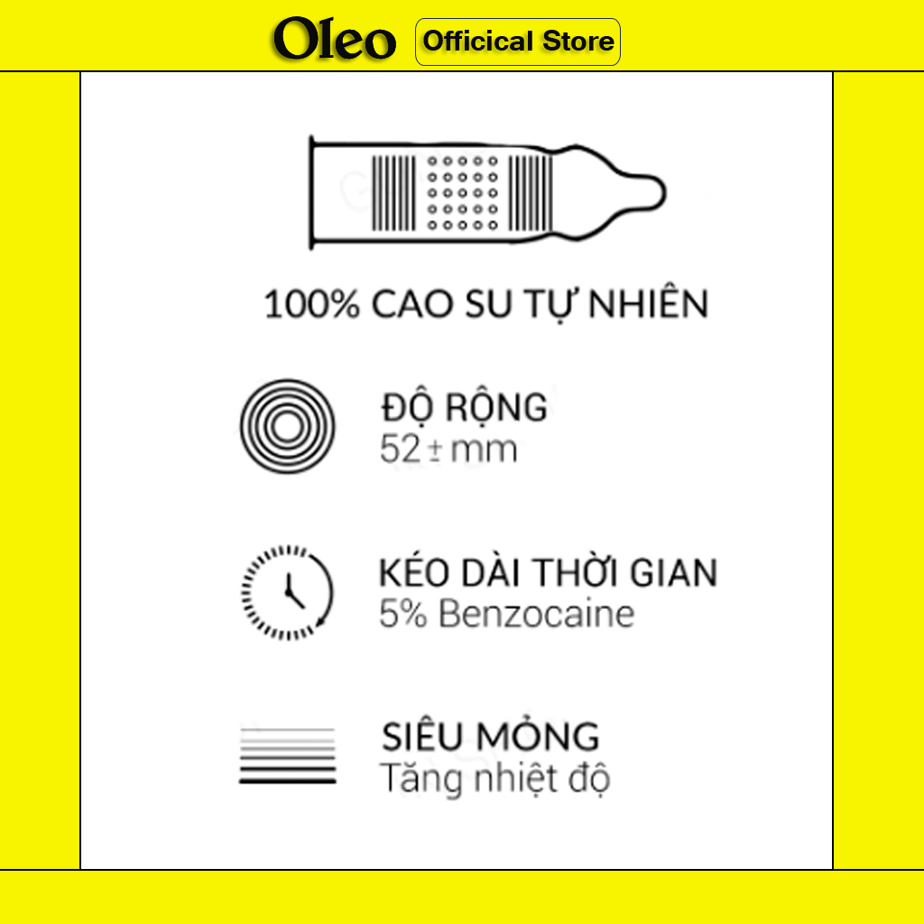 • Chất lượng Oleo gân gai: 100% bao cao su Oleo được kiểm nghiệm bằng điện tử cùng 5 công đoạn kiểm tra chất lượng, cũng như được kiểm nghiệm trên da.