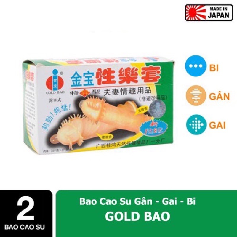 - Bao cao su gai, bi Gold Bao có nhiều bi hơn các loại bao cao su bi khác và những viên bi của bao cao su Gold Bao cũng nhỏ hơn và phân bố đều ở khắp phần đầu của bao, các viên bi này được dính chắc vào thành bao, đảm bảo sự chắc chắn tuyệt đối khi sử dụng.