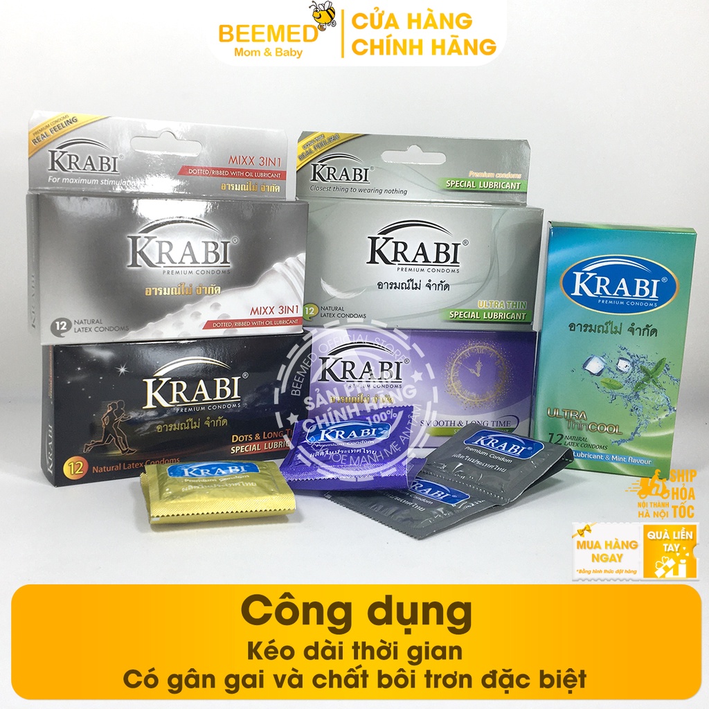 Sức Khỏe > Hỗ trợ tình dục > Bao cao su || Bao cao su Krabi - bcs gân gai siêu mỏng, kéo dài thời gian và bôi trơn, 49mm đôn dên - Hộp 12 chiếc condom từ Thái Lan