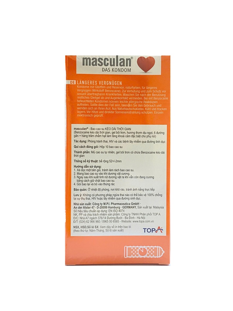 Bao cao su Masculan Long Pleasure có xuất xứ từ Đức là sự kết hợp hoàn hảo bởi nhiều tính năng: kéo dài thời gian, có gai và 6 lằn thắt, nhiều gel bôi trơn, hương dâu tây quyến rũ.