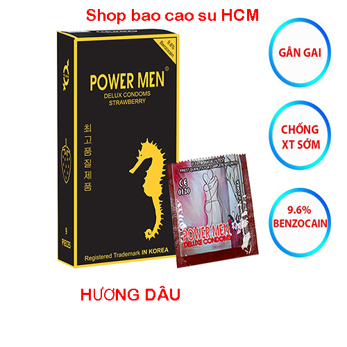 - Bao cao su Powermen Strawberry với mùi vị dâu tây và cấu trúc hạt nổi tăng cảm xúc để mang đến cho bạn trải nghiệm mới lạ ngọt ngào.