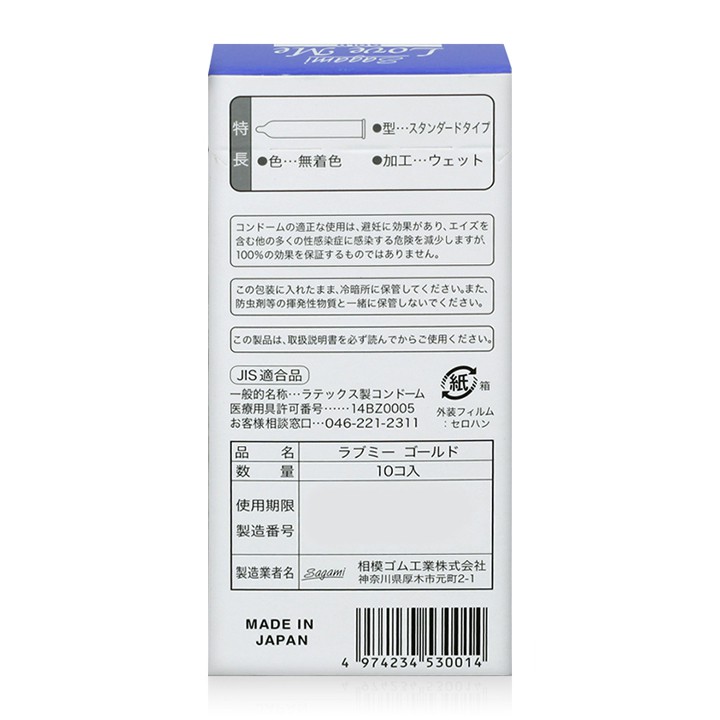 [SHOP ĐÓNG GÓI HỘP CẨN THẬN VÀ CHE TÊN SẢN PHẨM CÁC BẠN YÊN TÂM NHẬN HÀNG NHÉ] ★ Bao cao su siêu mỏng Sagami Love Me Gold - Xuất xứ: Chính hãng Sagami Nhật Bản - Nhà nhâp khẩu: Công ty CP Vật Tư Y Tế Hà Nội (HMP) - Nhập khẩu độc quyền Sagami tại Việt Nam - Trên sản phẩm có gắn tem công ty HMP - Phân phối chính hãng bởi Larva Store - Quy cách đóng gói: Hộp 10 chiếc - Hạn sử dụng: 5 năm từ ngày sản xuất - Date luôn rất mới - Công dụng: Tránh thai, ngăn ngừa nguy cơ lây nhiễm các bệnh lây lan qua đường tình dục