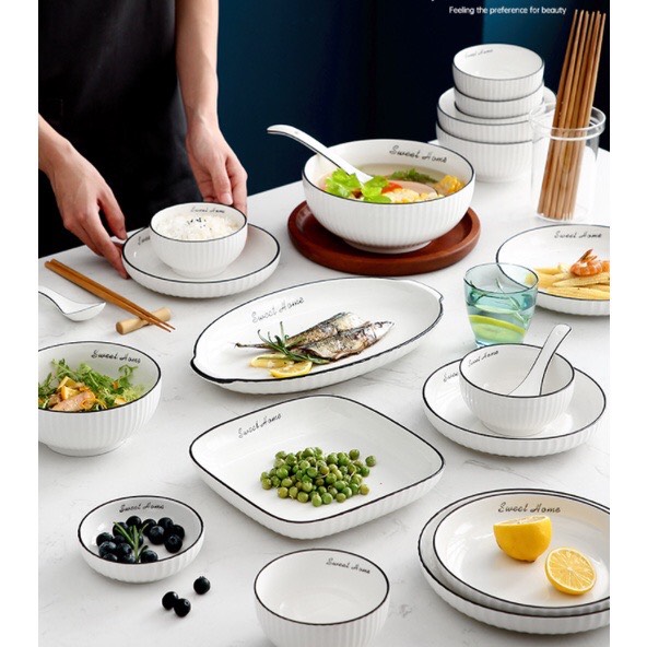 Bộ bát đĩa sứ màu trắng viền đen cao cấp