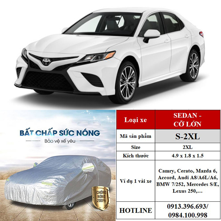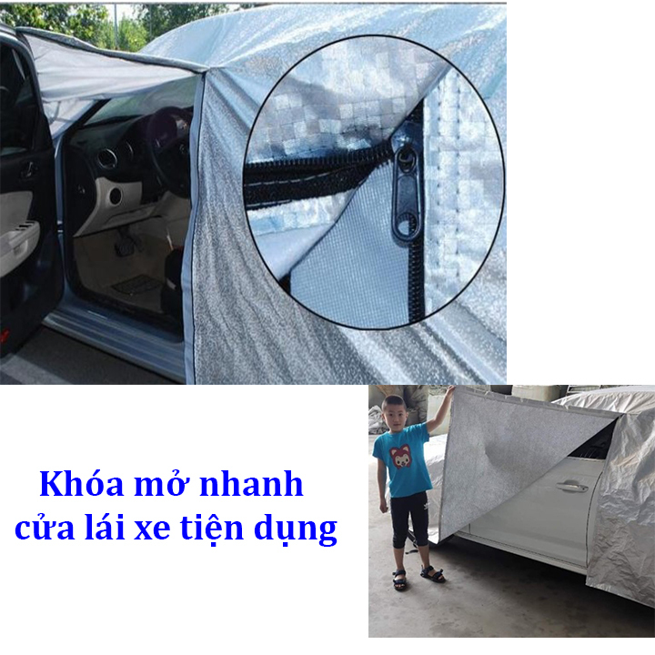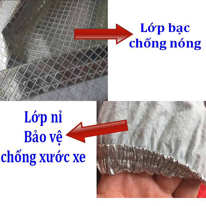 - Chất liệu: Vải cao cấp 2 mặt dầy dặn, lớp ngoài tráng nhôm cao cấp giúp phản chiếu nắng và cách nhiệt. Lớp trong là lớp nỉ cao cấp chống xước bảo vệ lớp sơn của xe.