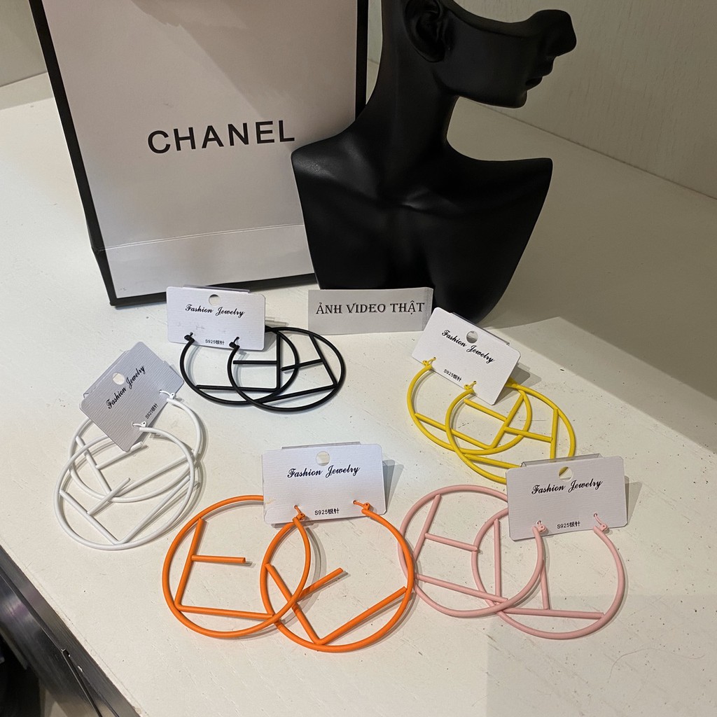 Giới thiệu BD93 Bông tai tròn chữ F màu sắc đen trắng cam hồng vàng đường kính 6cm