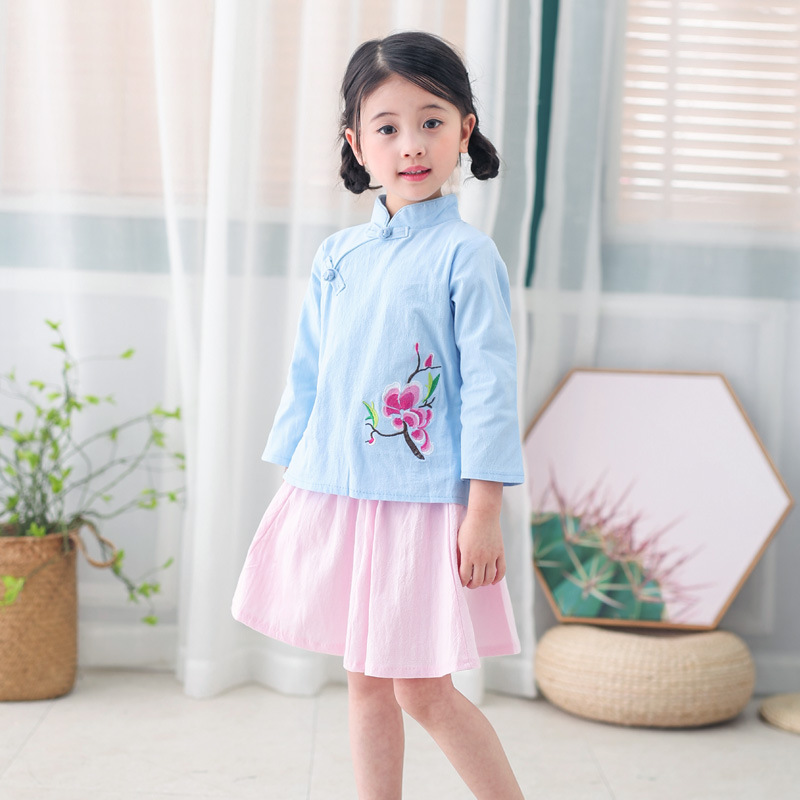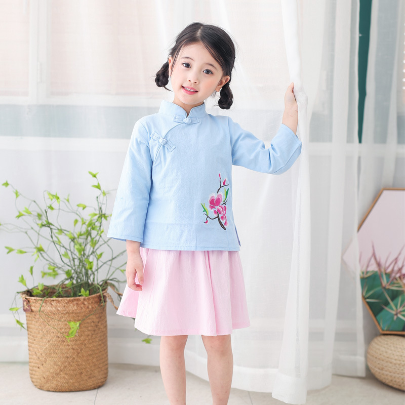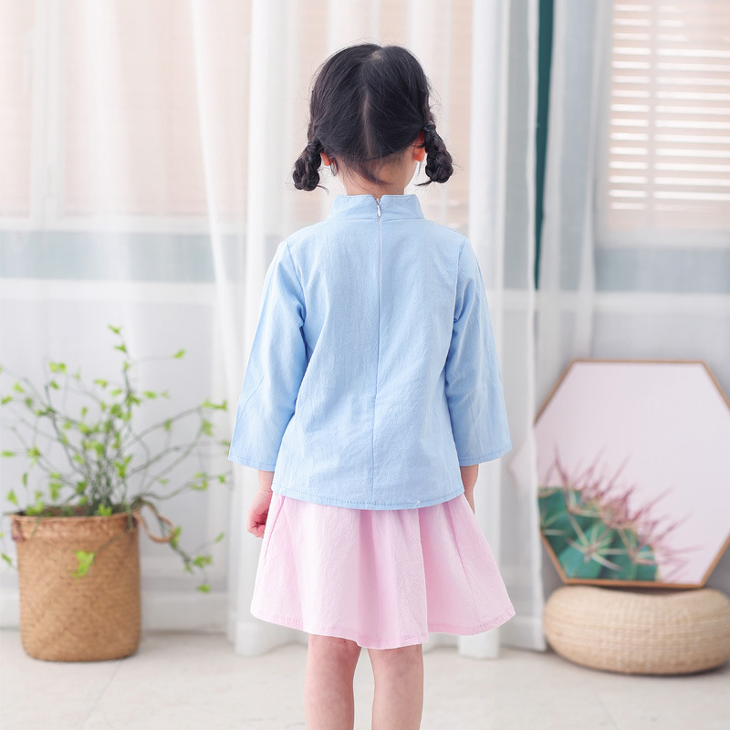 Bộ bé gái gồm áo cổ trụ nút tàu, thêu hoa chân áo