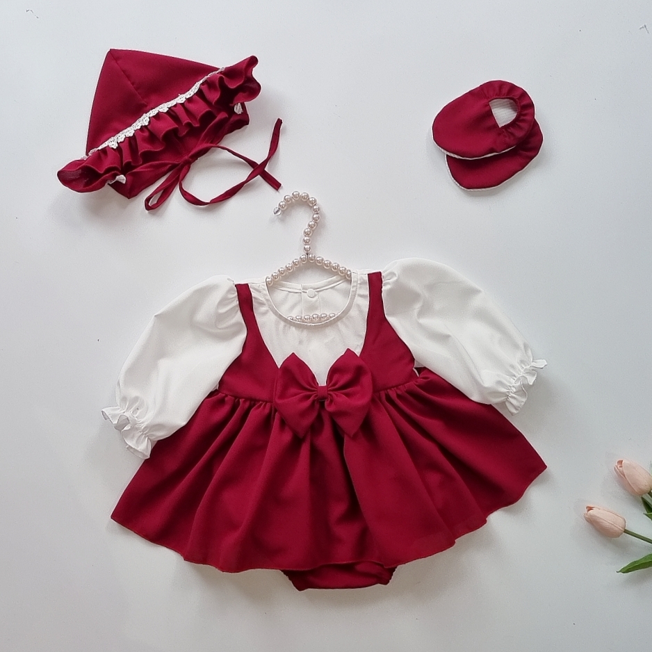 Với thiết kế bầu bĩnh, đáng yêu trên nền hoa nhí vintage, chiếc body xinh xắn được phối 1 cách khéo léo với yếm LỒNG VÁY BODY MÀU ĐỎ MẬN sang chảnh tạo ra điểm nhấn cực dễ thương
