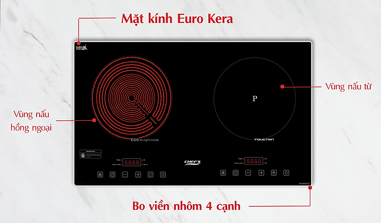Vùng nấu hồng ngoại: Sử dụng mâm nhiệt E.G.O Hi - light (Đức) là thương hiệu mâm nhiệt số 1 hiện nay cho bếp điện trên thị trường. Mâm nhiệt E.G.O Hi-light có độ hao mòn thấp, làm nóng nhanh, tích hợp phím chọn vùng nấu, phù hợp với nhiều kích thước đáy nồi.