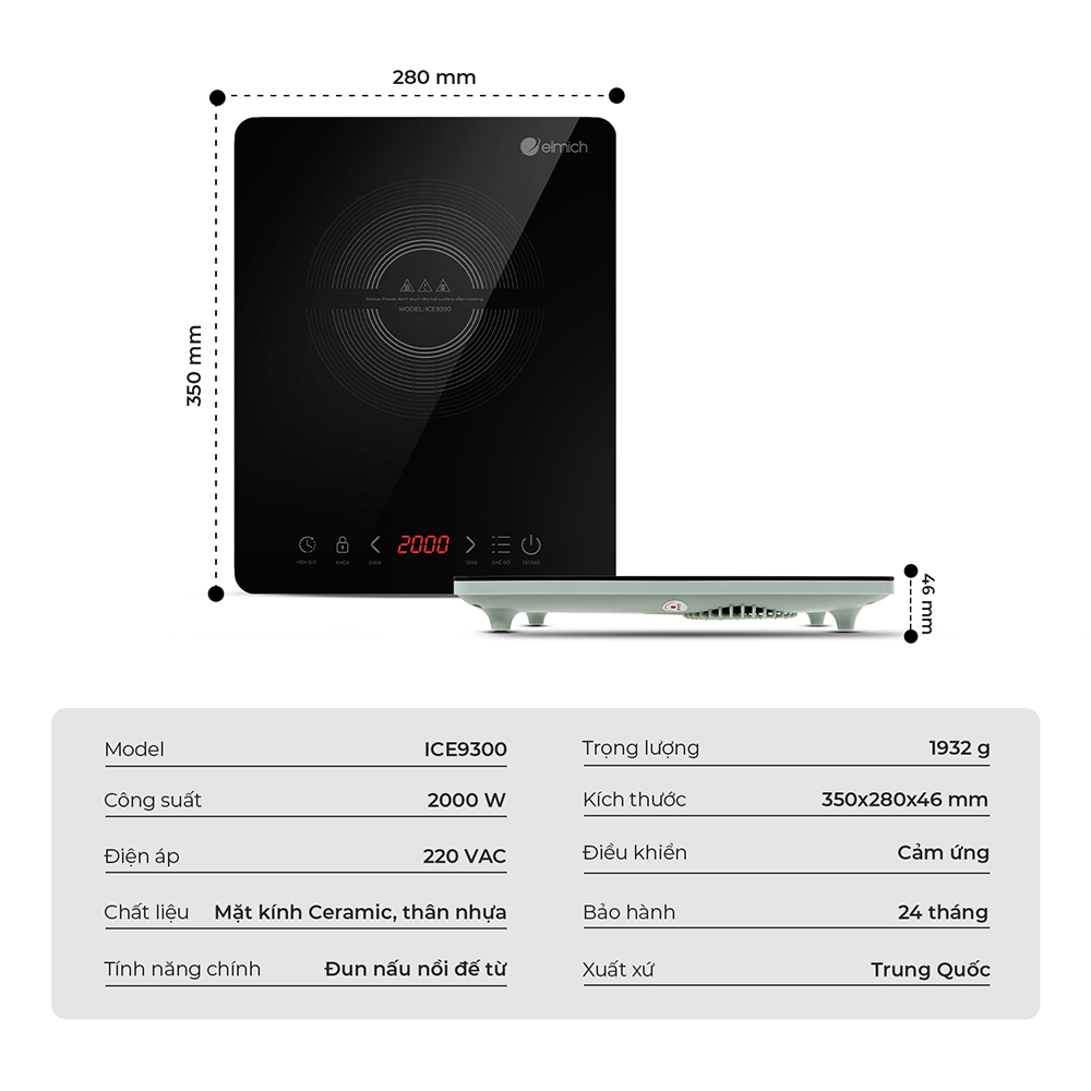 Bếp Điện Từ Elmich ICE9300 2000W, Hàng Chính Hãng, Cảm Ứng, Tự Ngắt Khi Quá Nhiệt, 9 Mức Độ -JoyMall