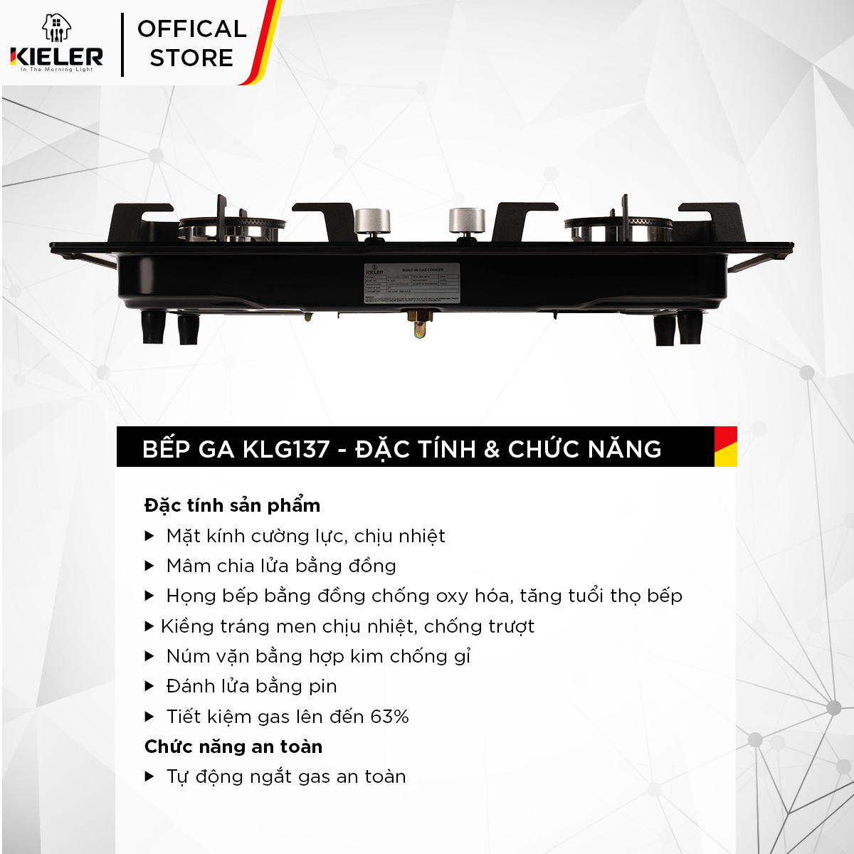 - Tên sản phẩm: Bếp gas mặt kính cường lực KIELER KL-G137 tiết kiệm gas, công suất mạnh 5000W, mặt bếp chịu nhiệt tốt - Miễn phí lắp đặt