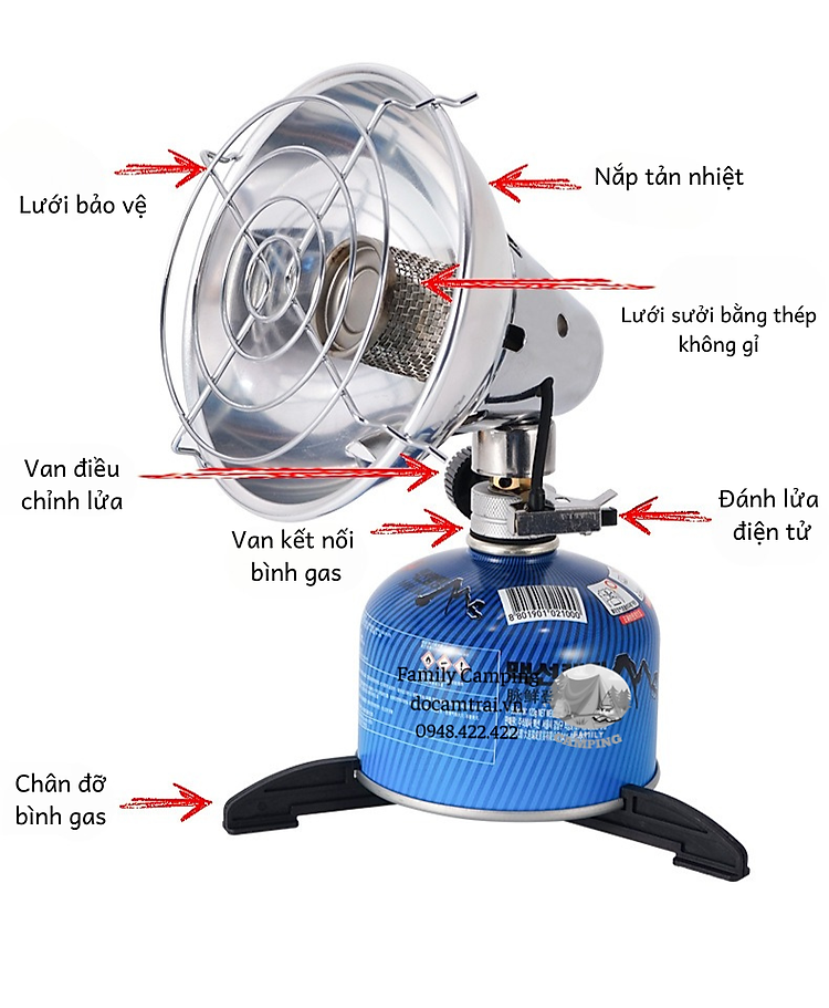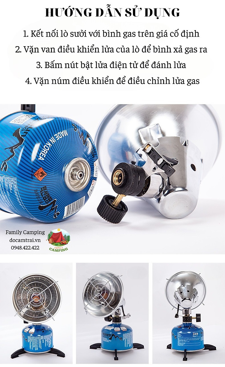 2. Công dụng: Gắn bếp sưởi vào bình gas và không cần điện.