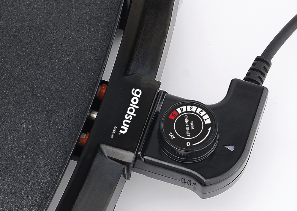 Bếp nướng điện Goldsun GEG3740 có 5 mức độ nhiệt khác nhau từ 115- 230℃, linh hoạt điều chỉnh bằng núm xoay.