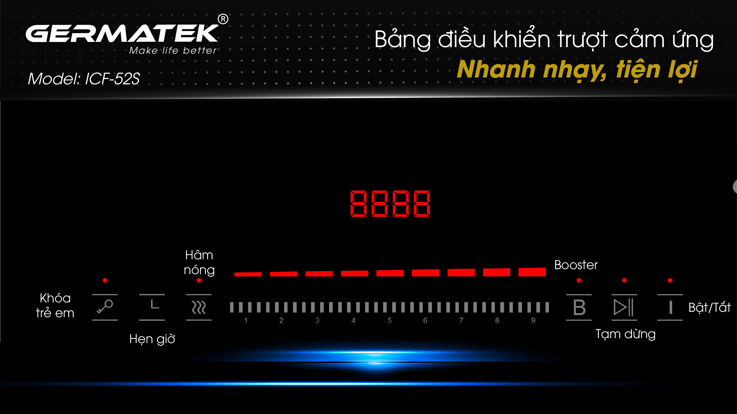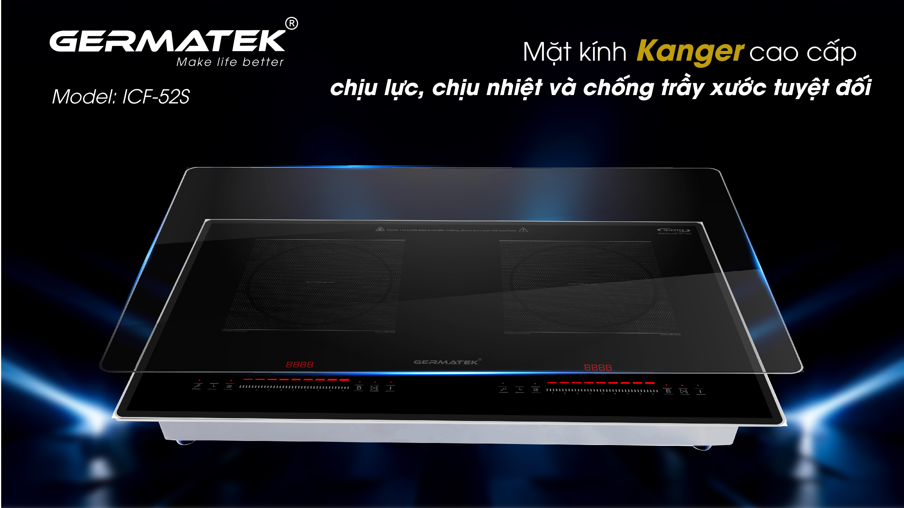 - Bếp từ Germatek DE-ICF52S sử dụng kính Kanger Glass cường lực nguyên khối được vát 4 cạnh sang trọng, tinh tế, mặt kính phẳng có khả năng chống sốc nhiệt tốt, chịu nhiệt cao, khó bị nứt vỡ ở điều kiện nhiệt độ thường, chống bám vân tay và dễ lau chùi.