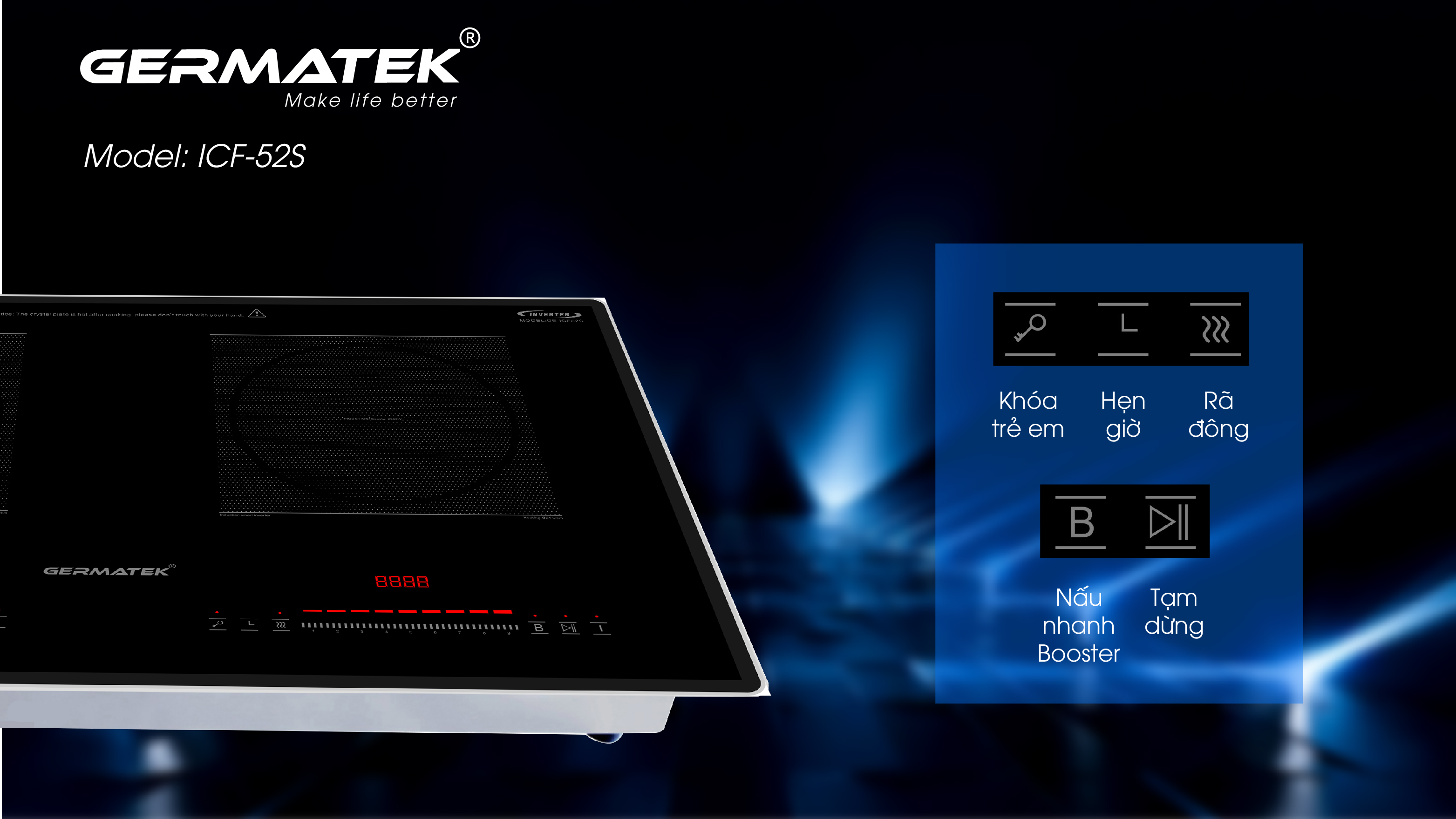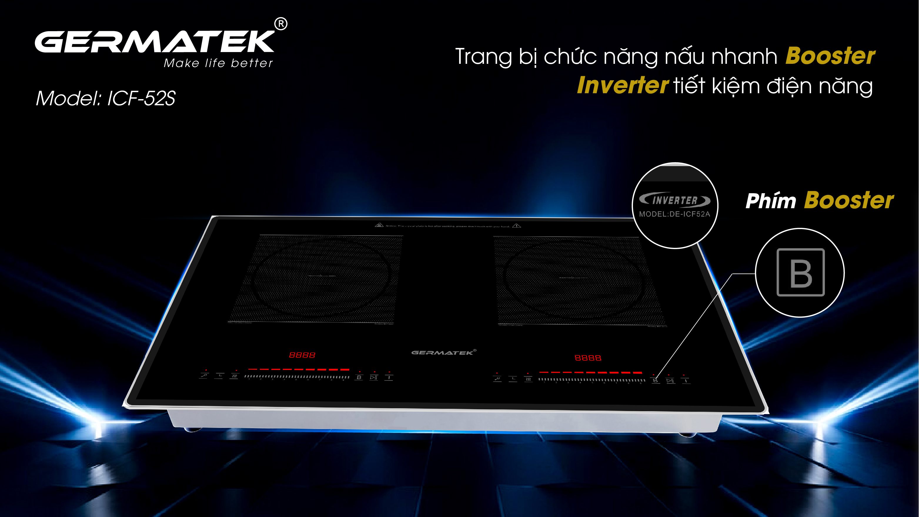 Bếp từ Germatek DE-ICF52S sử dụng công nghệ biến tần Inverter kiểm soát công suất của thiết bị, nhằm tránh hao phí năng lượng trong quá trình sử dụng. Nguyên tắc cơ bản của công nghệ Inverter là dựa trên kiểm soát từng tần số dao động (Hz) của các bảng mạch bên trong bếp, giúp đảm bảo độ ổn định của bếp, tiết kiệm tối đa năng lượng và gia tăng tính năng thông minh cho bếp.