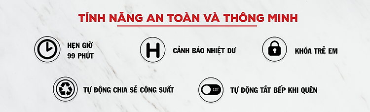 Cảnh báo nhiệt dư: Sau khi sử dụng, nếu vùng nấu mặt bếp còn nóng, màn hình sẽ hiển thị chữ H để cảnh báo để người dùng không chạm tay vào mặt bếp. Khi nhiệt độ mặt bếp giảm xuống mức an toàn, đèn báo chữ H sẽ tự động tắt.