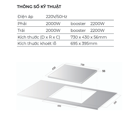 | Kích thước lắp đặt | Kích thước khoét lỗ: 690x390 (mm) |