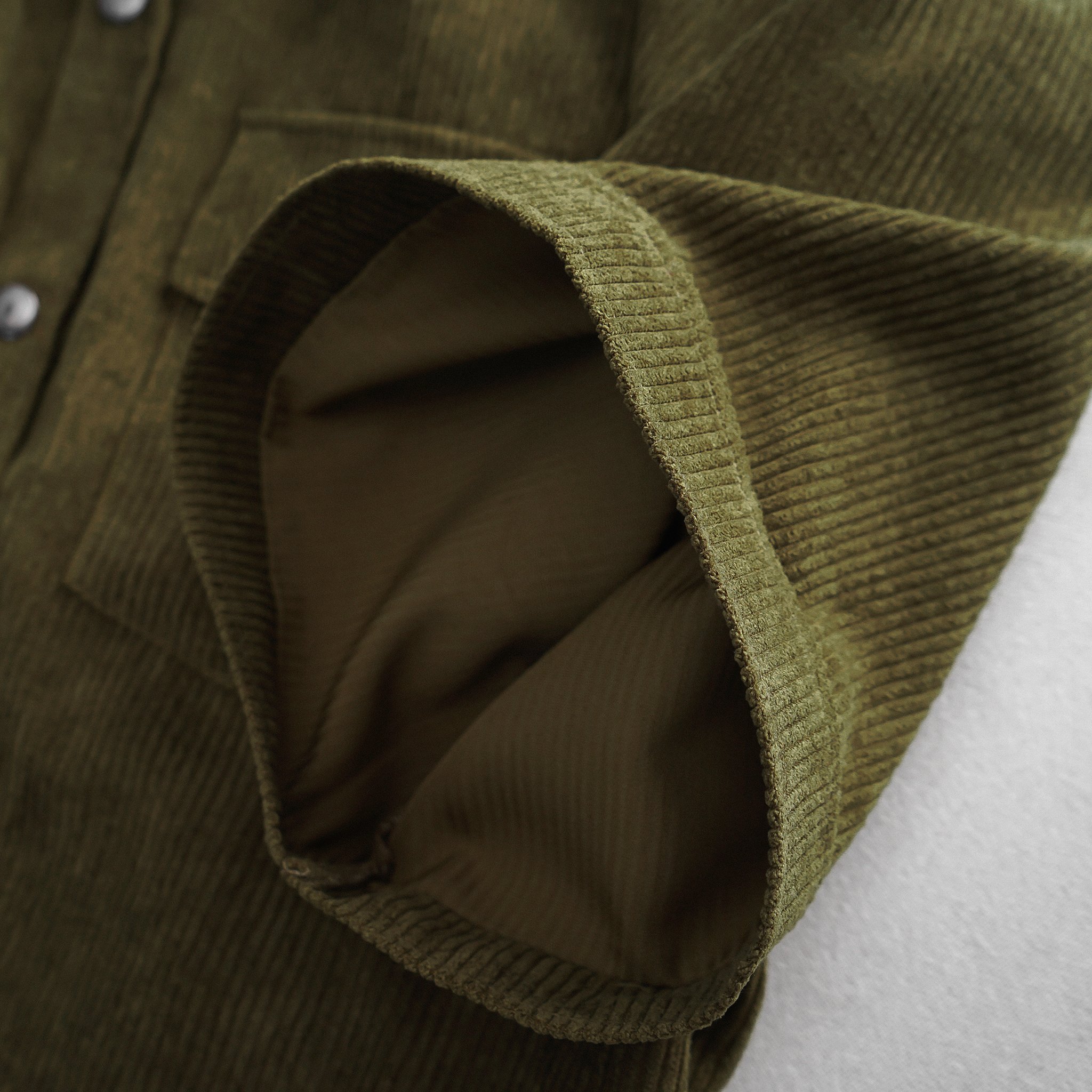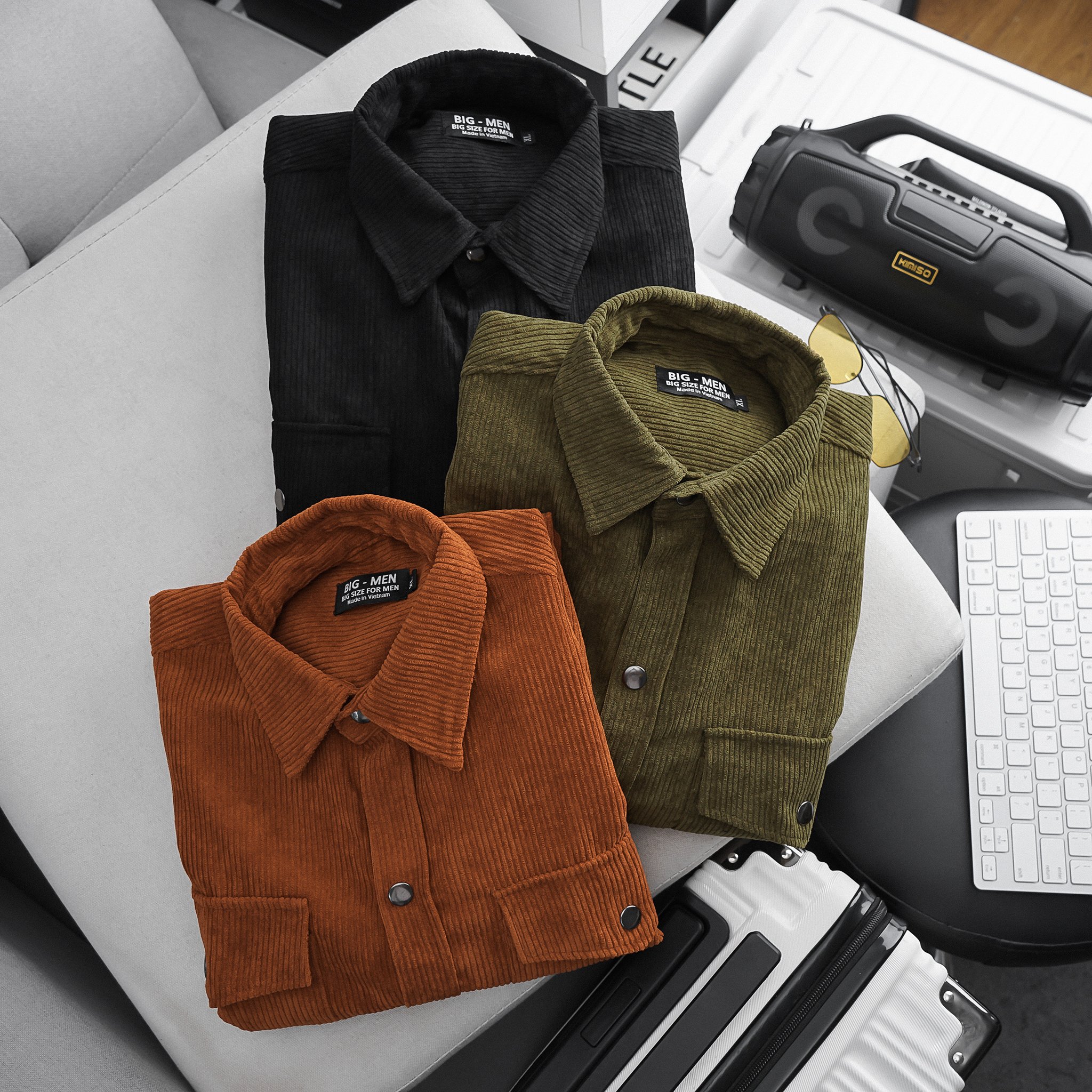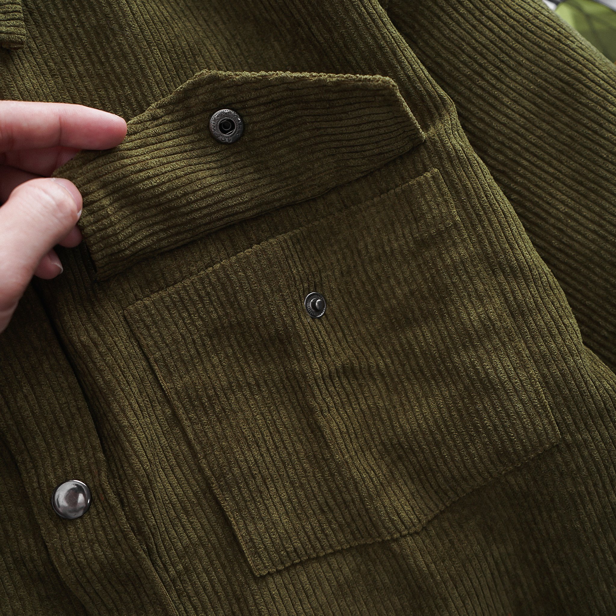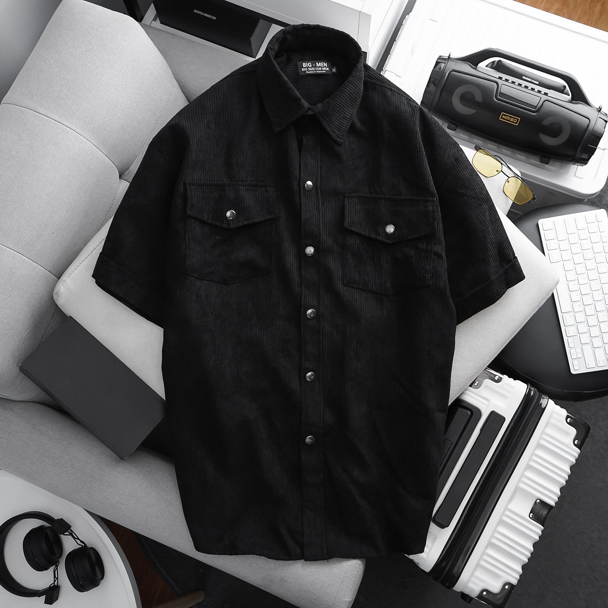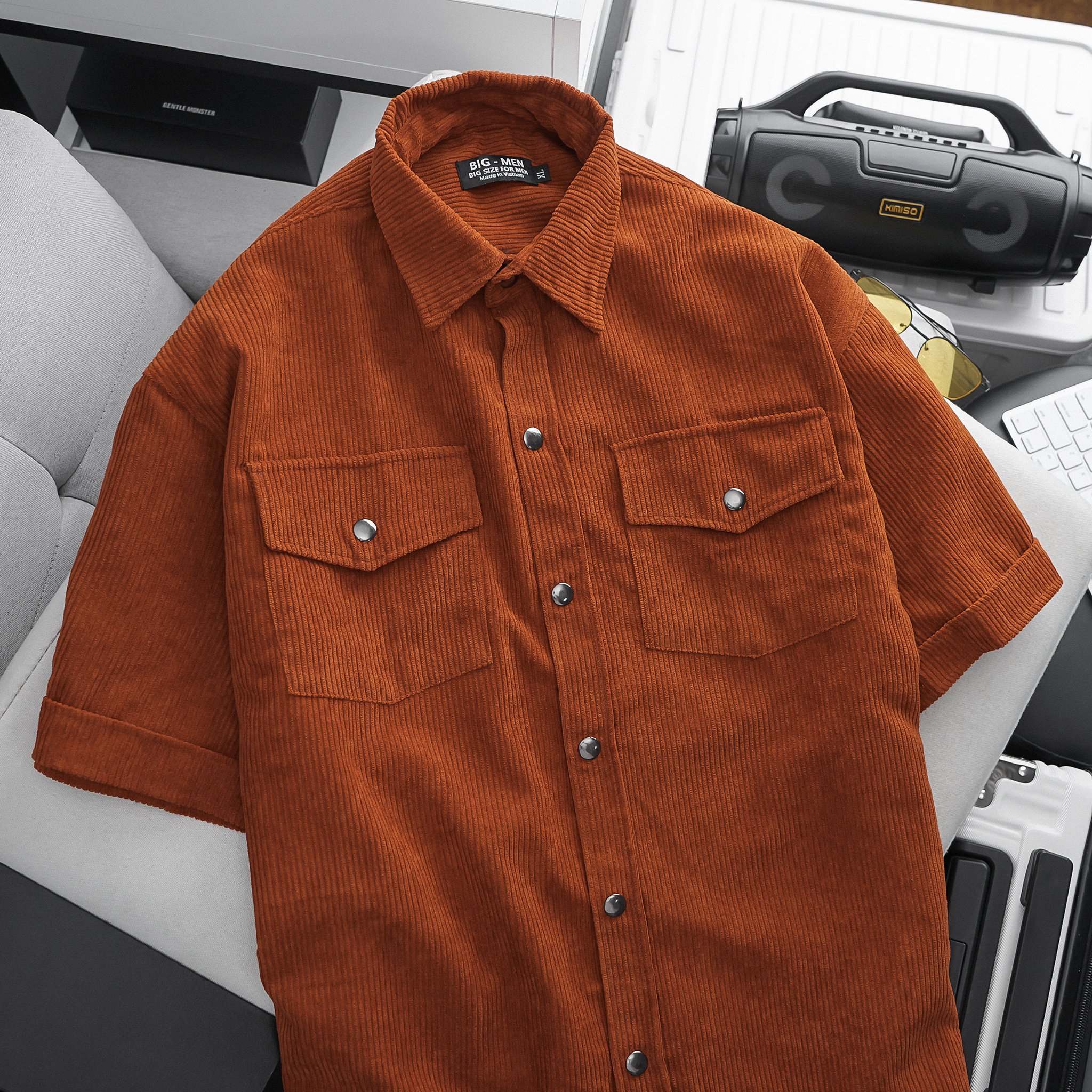 Dòng áo sơ mi tay ngắn vải nhung tăm phối túi cực thời trang, thích hợp làm áo khoát ngoài, phối với jean rất phong cách.