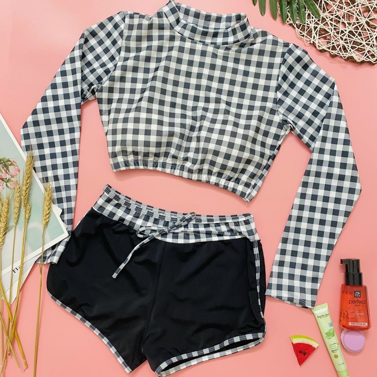 Giới thiệu Bikini 2 mảnh quần đùi kẻ caro, bộ bơi rời tắm biển cho nữ kín đáo Bikini191