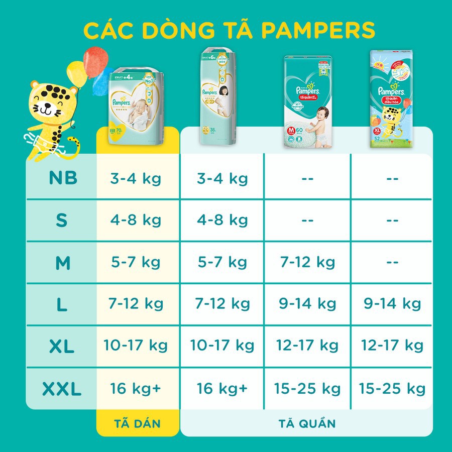 *Hướng dẫn chọn size tã quần Pampers S: dành cho bé 4-8kg M: dành cho bé 7-12kg L: dành cho bé 9-14kg XL: dành cho bé trên 12kg XXL: dành cho bé 15-25kg