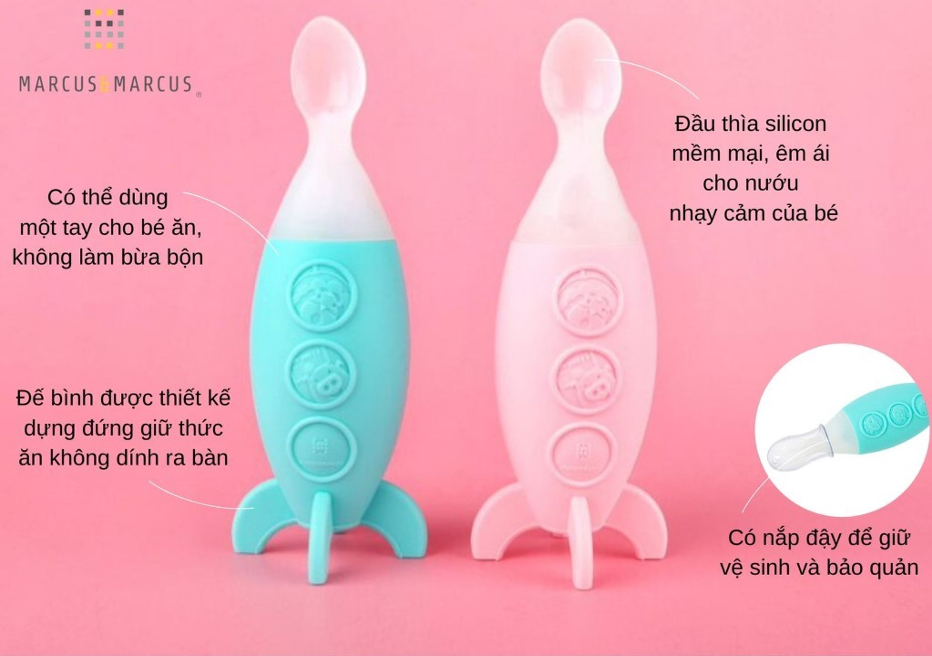 Cho bé ăn dặm không phải lúc nào cũng là công việc dễ dàng. Đó là lý do tại sao bình bóp ăn dặm Marcus & Marcus được thiết kế để giúp cho bữa ăn của bé được dễ dàng hơn. Chiếc bình bóp thay thế cho hộp thức ăn, sự bừa bộn và toàn bộ thức ăn được đựng trong chiếc bình bóp một tay tiện lợi. Thiết kế hình tên lửa thu hút sự chú ý của bé trong khi đó đầu thìa sẽ mớm thức ăn cho bé mỗi khi bóp thân bình. Đế bình dựng thẳng giữ cho thìa không chạm mặt bàn, vì vậy thìa và bàn luôn được sạch sẽ. Nắp bình có thể được đậy lại để bảo quản thức ăn mỗi khi gia đình đi ra ngoài. Bình bóp ăn dặm Marcus & Marcus có hai màu hồng và xanh dương.