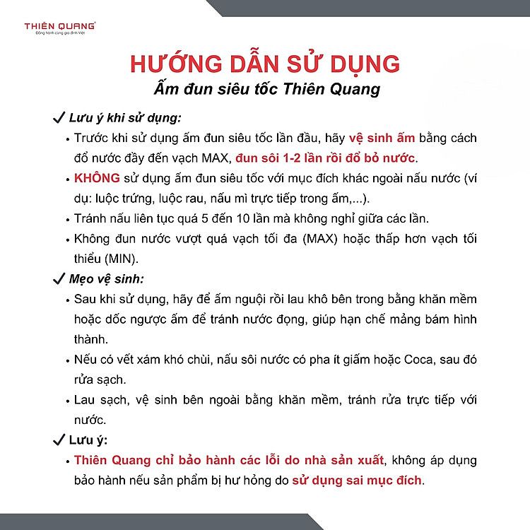 Sứ mệnh của THIÊN QUANG chính là đồng hành cùng gia đình Việt nên mỗi sản phẩm đều là 1 người bạn thông minh, bền bỉ và không thể vắng mặt trong đời sống hàng ngày. Từ đó, giúp bạn xây dựng 1 cuộc sống thông minh, hiện đại và tiện nghi hơn.