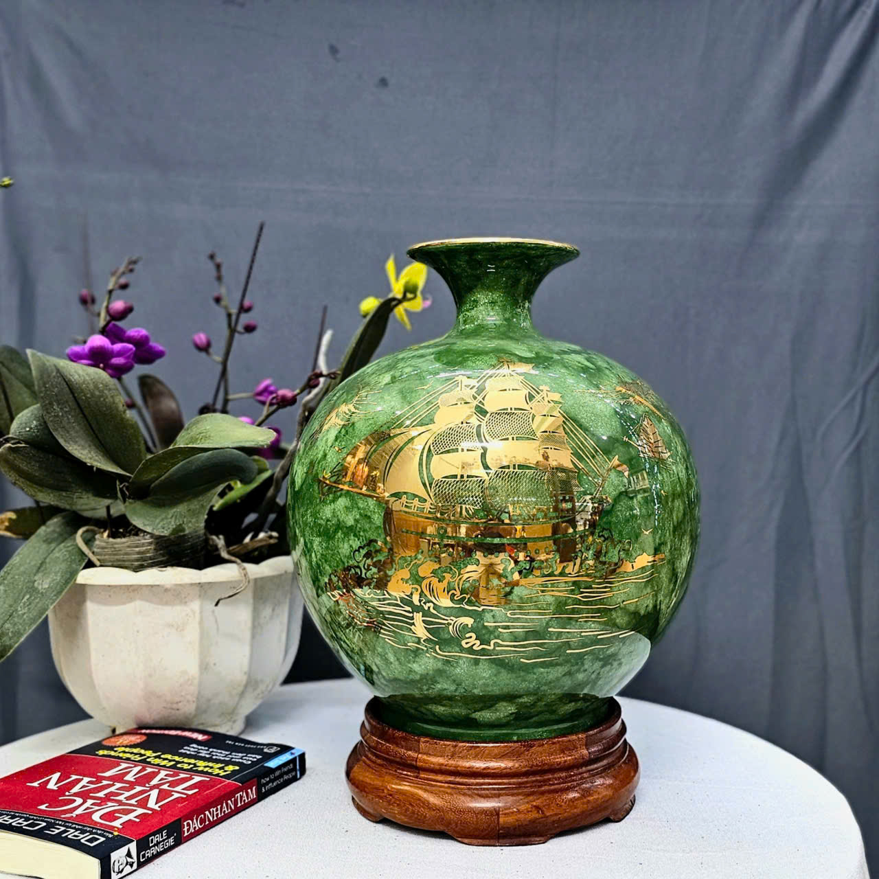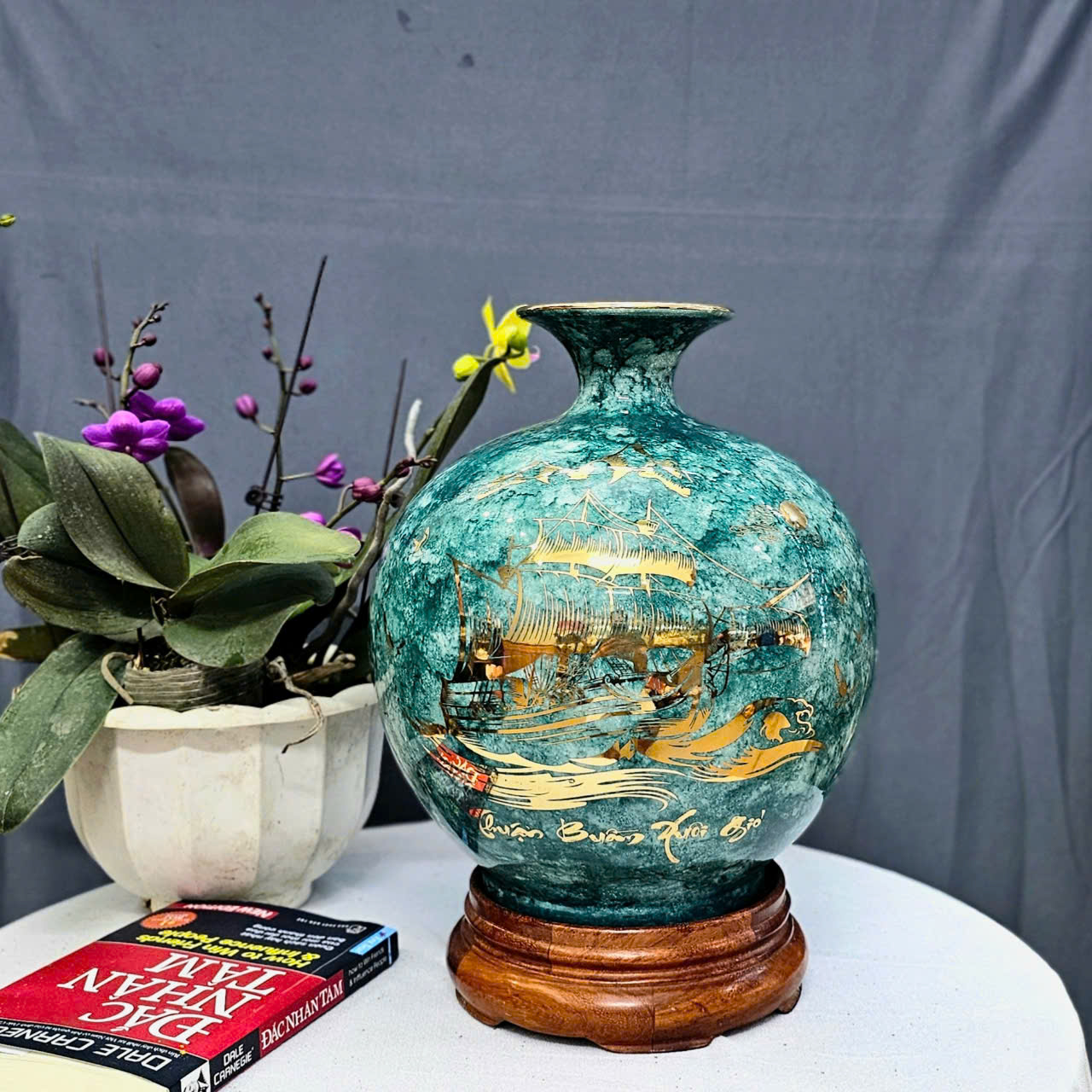 Bình hút tài lộc thuận buồm xuôi gió vẽ vàng 18k men xanh vân đá H25, H30 cm gốm sứ Bát Tràng tặng kèm đế gỗ
