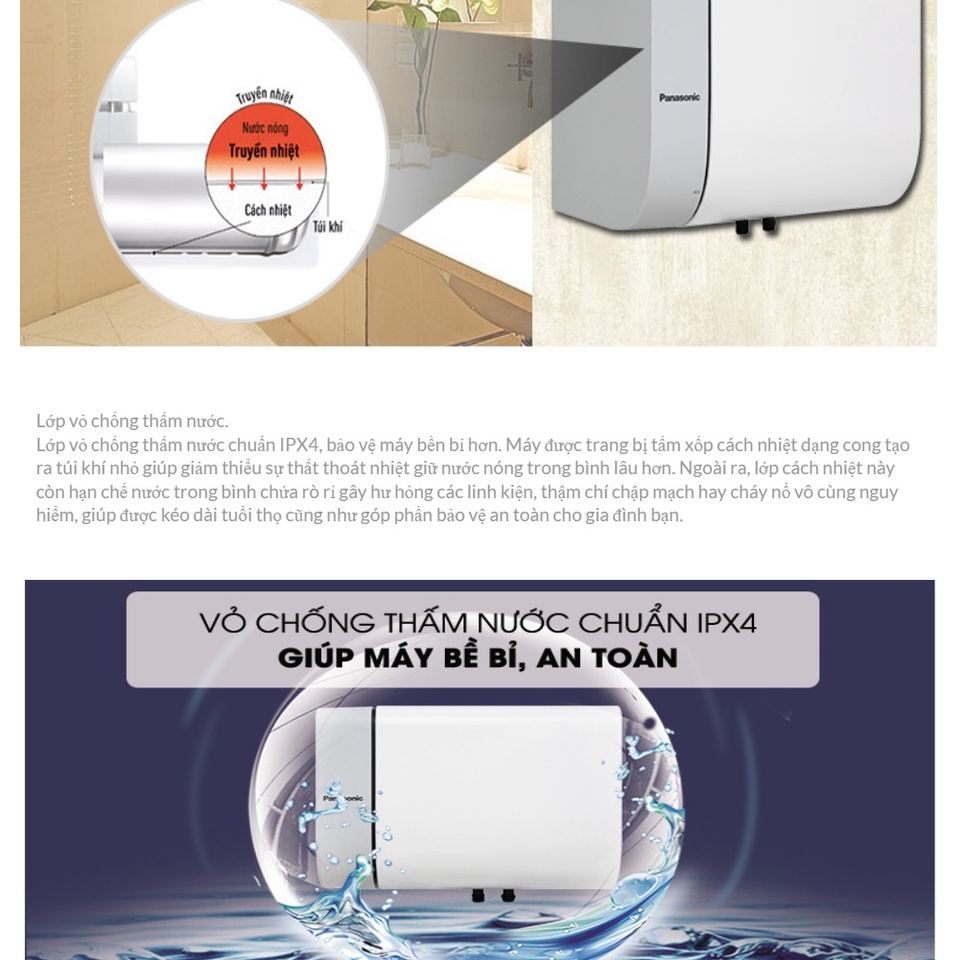 1. Mô tả sản phẩm - Máy nước nóng Panasonic thế hệ mới được sản xuất bằng chất liệu thép không gỉ với công nghệ tiên tiến Nhật Bản, mang đến độ bền lâu dài, an toàn vượt trội và tiết kiệm điện năng hơn. Với đa dạng các mẫu mã máy nước nóng như máy nước nóng trực tiếp có bơm trợ lực, máy nước nóng trực tiếp không có bơm trợ lực, máy nước nóng gián tiếp giúp bạn dễ dàng lựa chọn thiết bị phù hợp với gia đình mình. - Máy nước nóng gián tiếp Panasonic DH-15HBMVW có thiết kế chữ nhật ngang đơn giản và trung tính dễ dàng kết hợp với mọi kiểu không gian nội thất của gia đình. Ruột bình chứa được làm từ thép cao cấp cho khả năng chống gỉ bền bỉ. Thanh đốt bằng đồng giúp hiệu quả truyền nhiệt tốt hơn, làm nóng nước nhanh chóng. Thiết bị là một chiếc máy cần thiết cho mọi gia đình, nhất là trong những ngày đông lạnh giá hay những ngày mưa tầm tã.