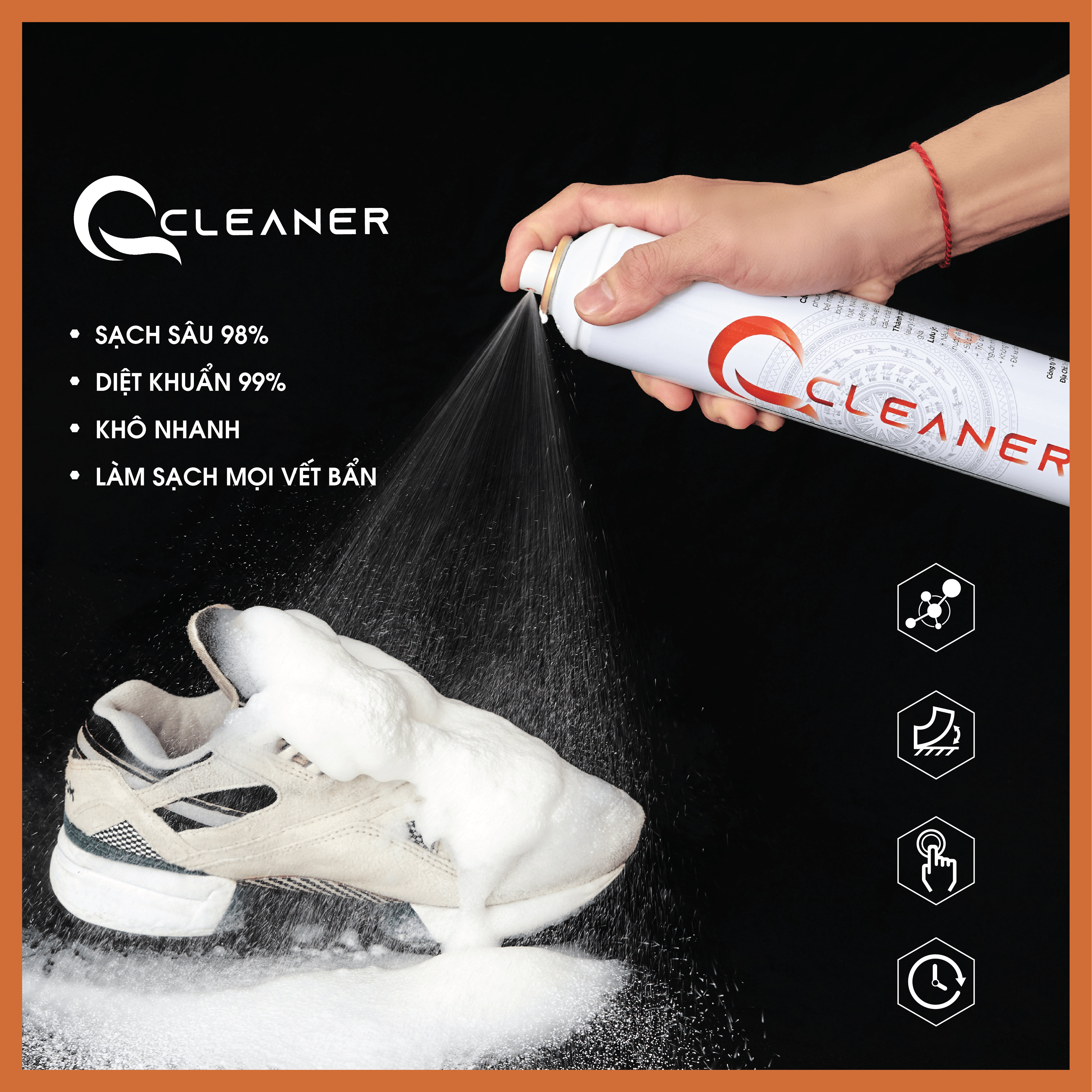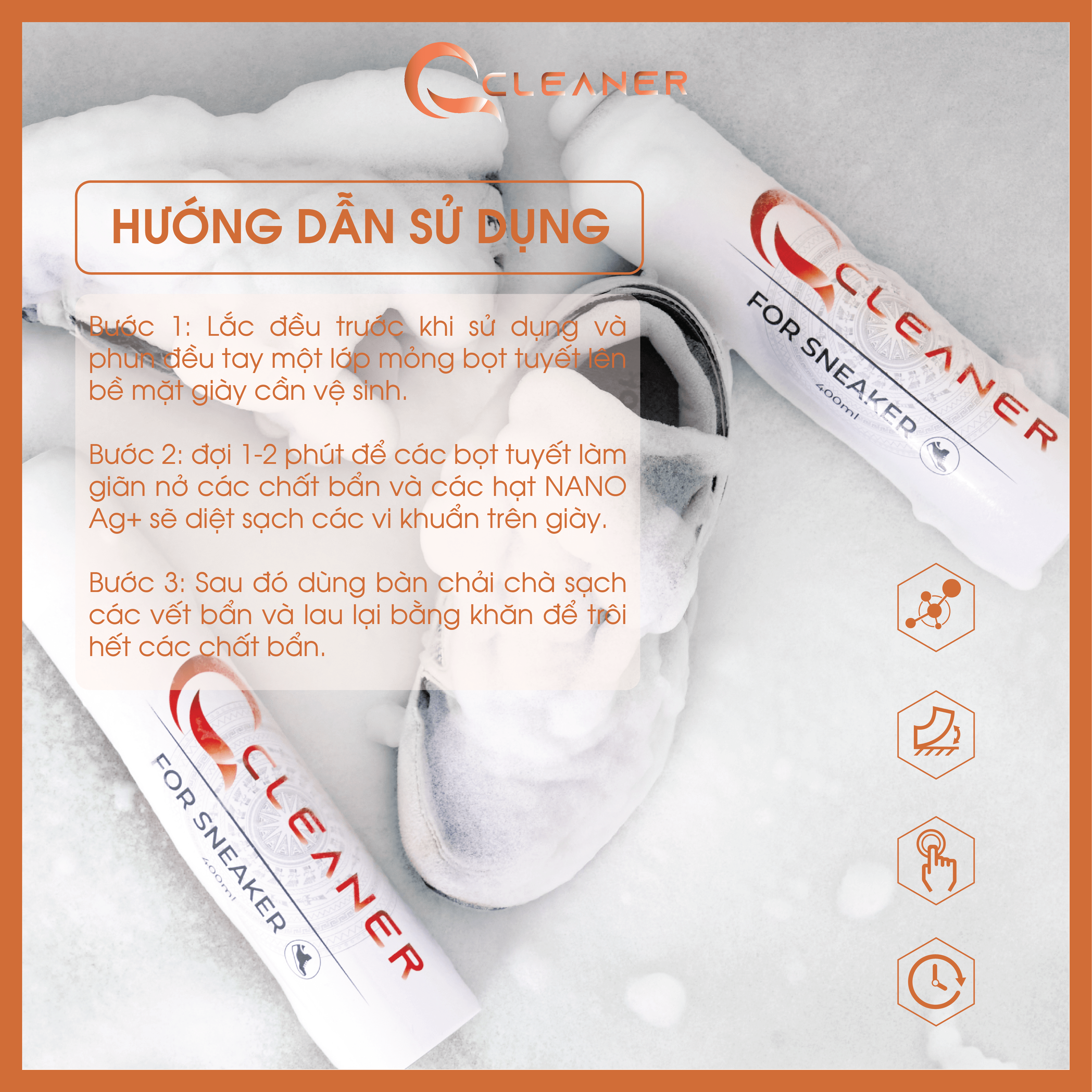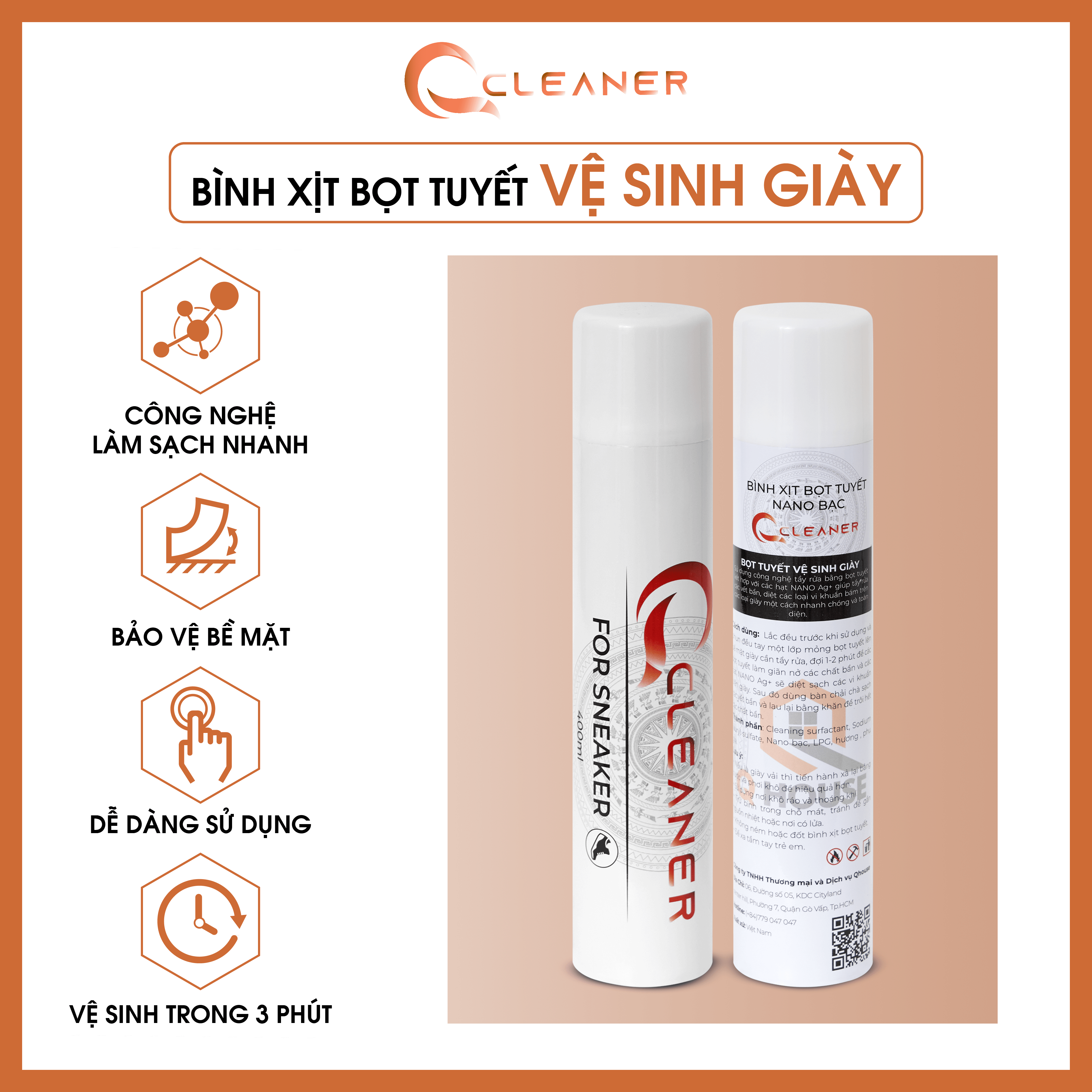 Bình xịt bọt tuyết Nano bạc Q CLEANER Sử dụng công nghệ tẩy rửa bằng bọt tuyết kết hợp với các hạt NANO BẠC giúp tẩy rửa các vết bẩn, diệt các loại vi khuẩn bám trên các loại giày một cách nhanh chóng và toàn diện.