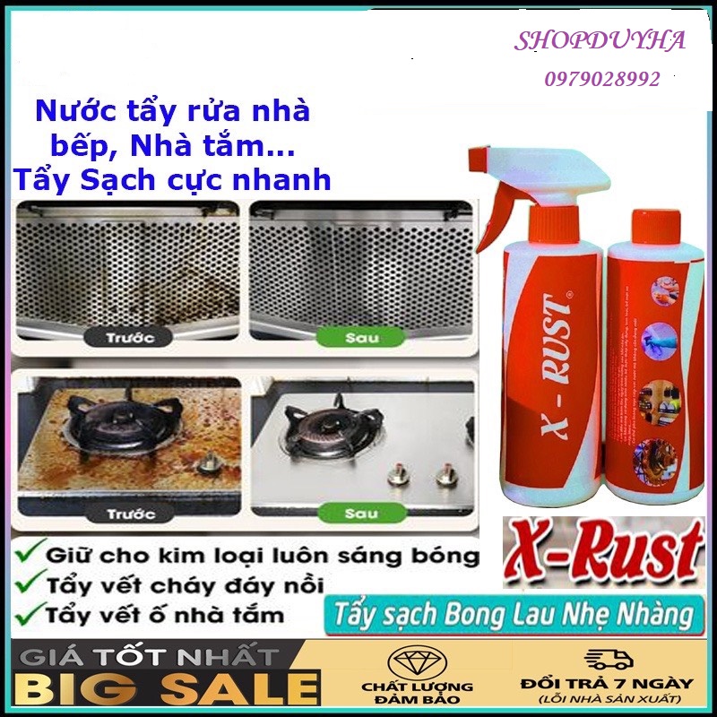 Chai xịt XRUST tẩy rửa nhà bếp đa năng đánh bay vết bẩn trên mọi bề mặt sản phẩm 👉 CÔNG DỤNG: - Tẩy sạch ngay: Vòi sen inox, gạch men sứ, gương, bồn cầu,... - Đánh bay dầu mỡ ở bếp ga, hút mùi, nồi chảo, chậu rửa,... Chai xịt XRUST tẩy rửa nhà bếp đa năng đánh bay vết bẩn trên mọi bề mặt sản phẩm - Vệ sinh vết bẩn lâu năm, gỉ sét, đất đỏ, phèn - Không làm mòn gạch men nguyên bản - Không kích ứng, an toàn cho người dùng - Làm mới đồ cũ, đồ vật inox kim loại - Làm mới đồ cũ, đồ vật inox kim loại CAM KẾT 1 ĐỔI 1 TRONG 7 NGÀY NẾU CÓ LỖI CỦA SHOP BẢO HÀNH 12 THÁNG TOÀN BỘ SẢN PHẨM Giao hàng tận nơi trên toàn quốc, Nhận hàng nhanh chóng tại nhà. Cám ơn quý khách đã tin tưởng và ủng hộ Chai tẩy rửa đa năng, Bình xịt tẩy rửa nhà bếp X-Rust, Tẩy sạch mọi vết bẩn 👉SẠCH NGAY RỈ SẮT - CẶN CANXI - ĐỒ BẾP Ố BẨN LÂU NĂM VỚI NƯỚC TẨY RỬA CÔNG NGHỆ ĐỨC X-RUST