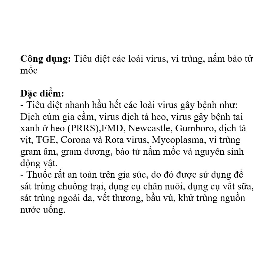 - Sát trùng chuồng trại khi có dịch: 10 ml / 2 lít nước ( 5/1.000 )