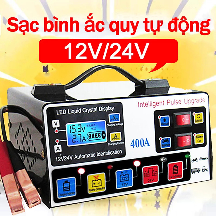 Tự động áp dụng cho pin axit chì 12V / 24V Thích hợp cho xe máy/ô tô/xe tải/pin Tự động sạc theo chu kỳ và chỉnh dòng sạc phù hợp với dung lượng Acquy 12/24v từ 6ah đến 400ah