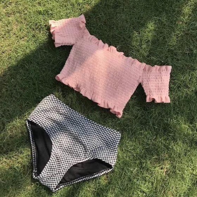 Giới thiệu [BKN376] <HÀN> SET BIKINI TRỄ VAI HỒNG QUẦN KẺ CẠP CAO (CÓ GỌNG)
