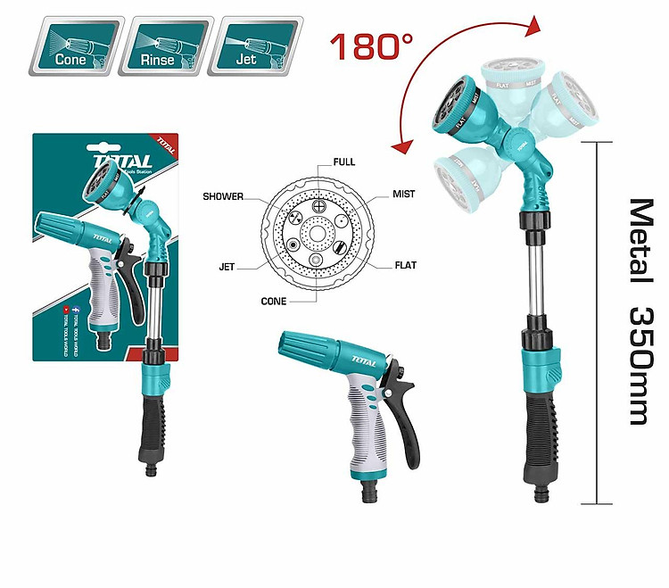 Bộ combo 2 đầu phun gồm: 1 đầu phun kích hoạt 3 chiều có thể điều chỉnh. Bộ chuyển đổi 3/4 inch. Thân nhựa ABS chống va đập cao với TPR, Tay cầm cách điện TPR mềm mại thoải mái 1 đầu phun kích hoạt 6 chiều có thể điều chỉnh. Bộ chuyển đổi 3/4 inch. công tắc bật / tắt. 6 kiểu phunn: phun đầy đủ, vòi sen, phun sương phẳng hình nón. 12/t