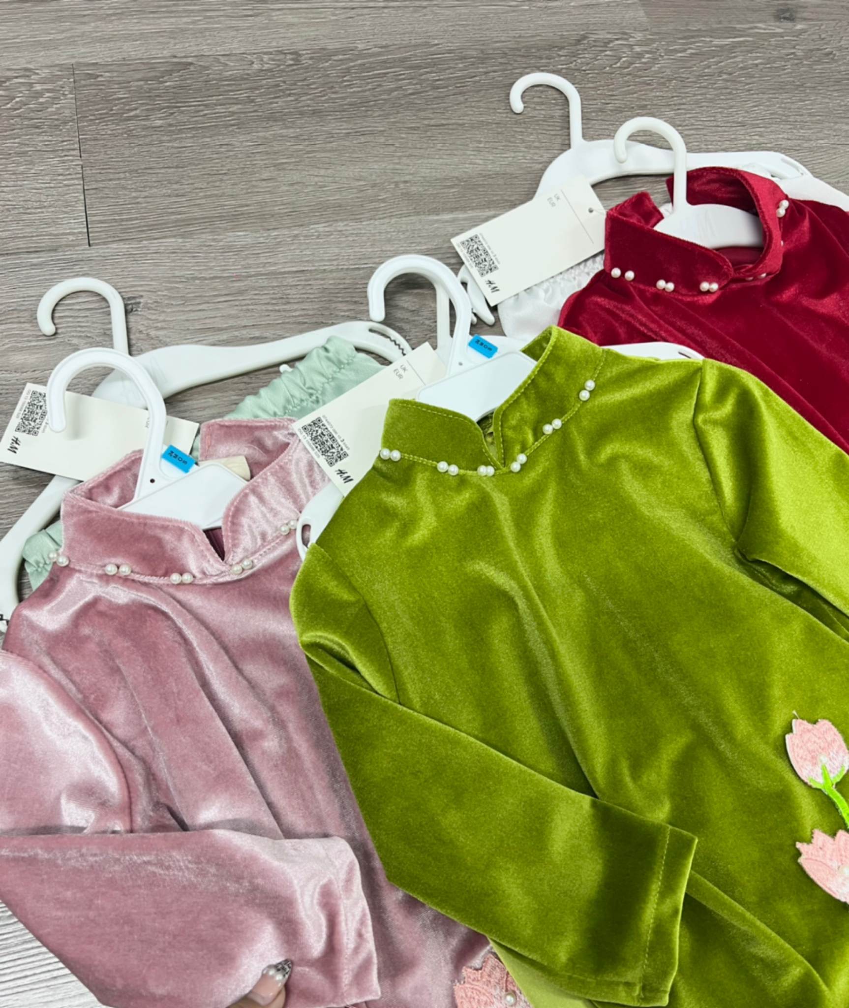 Màu Đỏ đô phối cùng quần trắng luôn trường tồn cùng thời gian, kết hợp hợ tiết hoa sen đính ngọc nổi bật lên từng chi tiết. Bé mặc siêu yêu