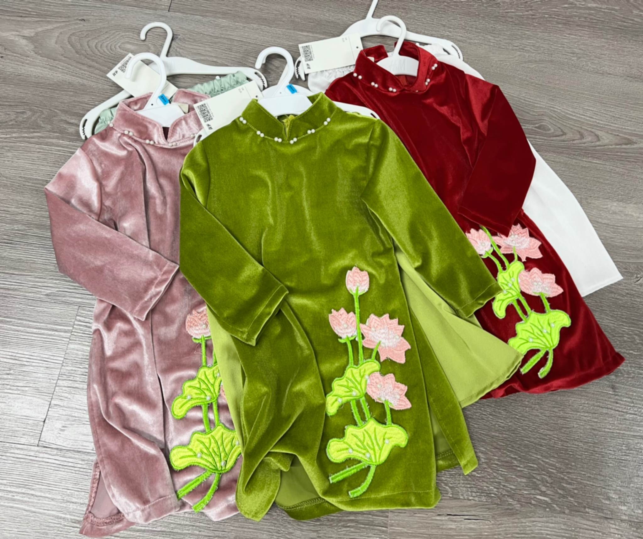 BỘ ÁO DÀI NHUNG CHO BÉ GÁI HỌA TIẾT HOA SEN KÈM BỜM