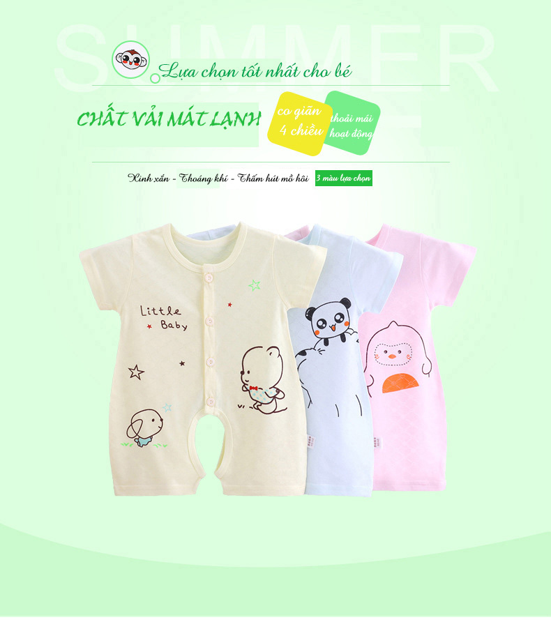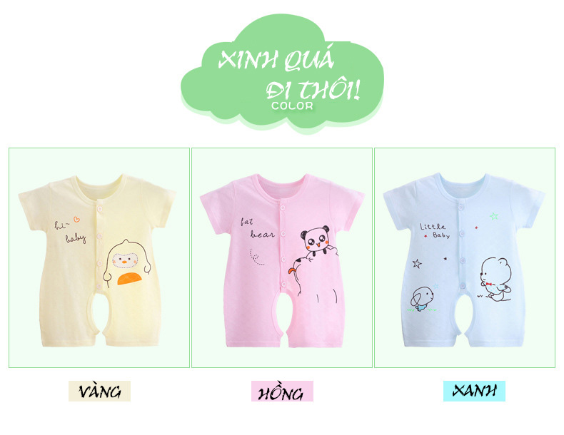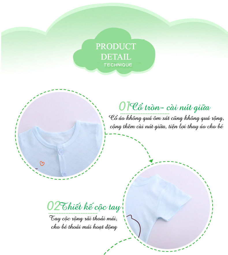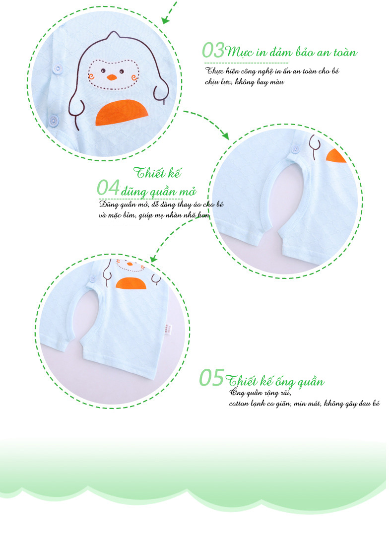 - Thiết kế cài giữa và đũng quần mở, mẹ dễ dàng thay áo và bĩm cho bé