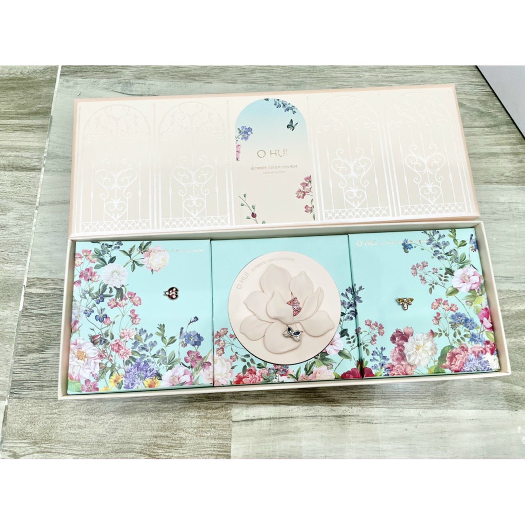 Set phấn nước Ohui Ultimate Cover Cushion Moisture 2 lõi với khả năng che phủ mạnh mẽ.