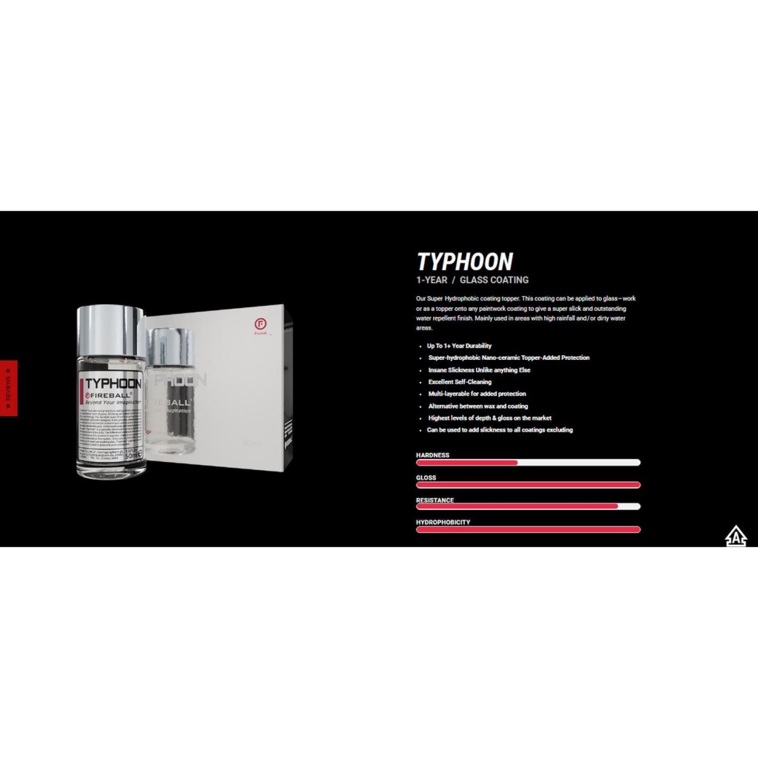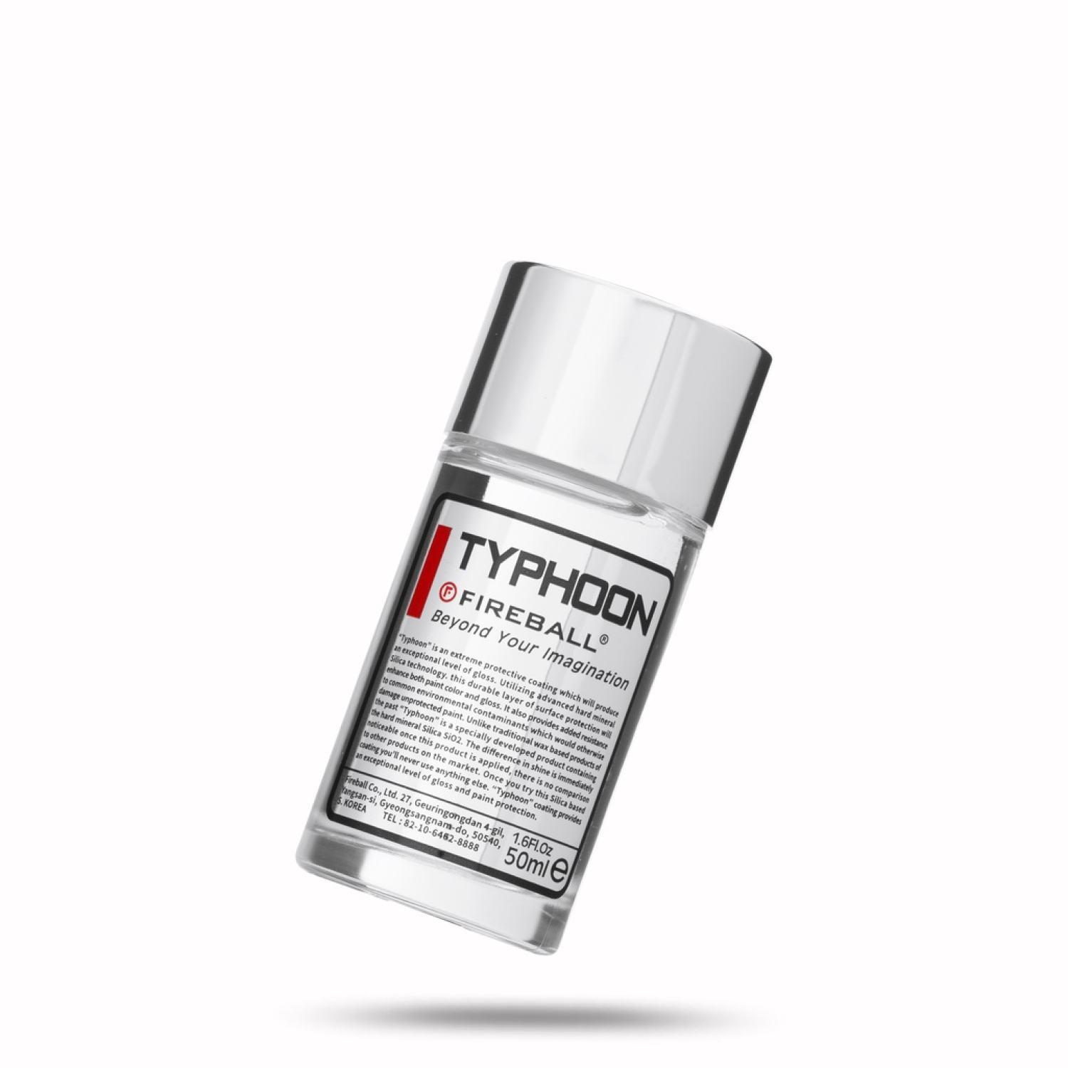 TYPHOON là dung dịch phủ siêu chống bám nước . Dung dịch này có thể được dùng để phủ kính hoặc làm lớp phủ trên cùng cho bất kỳ lớp phủ sơn nào để tạo ra một lớp phủ hoàn thiện siêu bóng và chống thấm nước vượt trội.