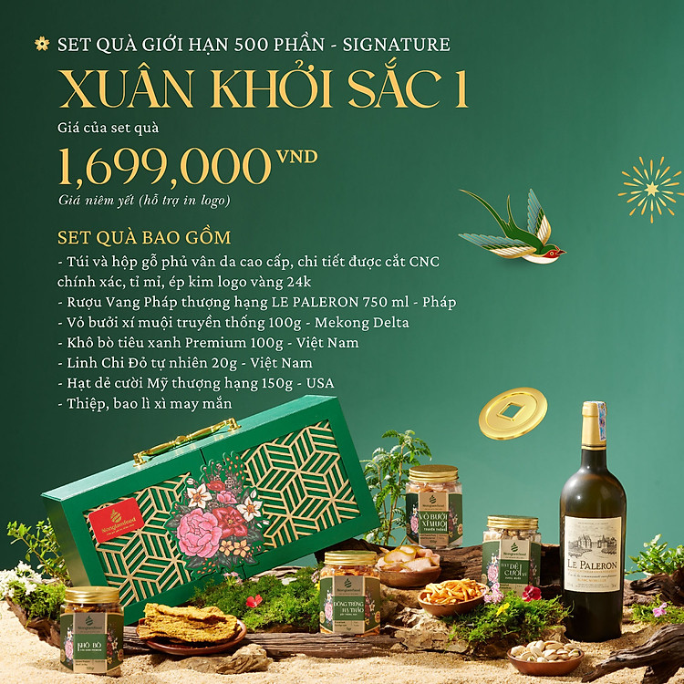 Linh chi đỏ thảo dược quý của đại ngàn, khô bò tiêu xanh đặc sản vùng cao, hạt dẻ cười nhập khẩu Mỹ, hay vỏ bưởi sấy dẻo kết hợp xí muội lạ miệng, tất cả được kết hợp hòa nhất mang đến lựa chọn quà Tết cao cấp với đầy đủ mỹ vị nhân gian. Ngoài ra không thể không nhắc đến thành phẩm của giống nho vùng ven biển Địa Trung Hải được lên men và ủ theo phương pháp truyền thống cho ra đời dòng r.ư.ợ.u vang Pháp Le Paleron, r.ư.ợ.u có màu vàng nhạt có hương thơm của trái cây tươi, vị ngọt mát, rất thích hợp được dùng trong các dịp họp mặt quan trọng, đặc biệt là dịp Tết.