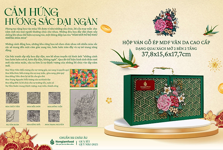 Thiết kế quai xách mạ vàng cứng cáp là điểm nhấn bật lên khí chất quyền quý, hoàng gia của tổng thể hộp. Hình ảnh đóa hoa mẫu đơn nở rộ cùng khoe sắc bên hoa đồng tiền, hải đường, thủy tiên, nụ tầm xuân,... muốn nhắn gửi thông điệp cho một năm mới hưng thịnh, nhiều may mắn.