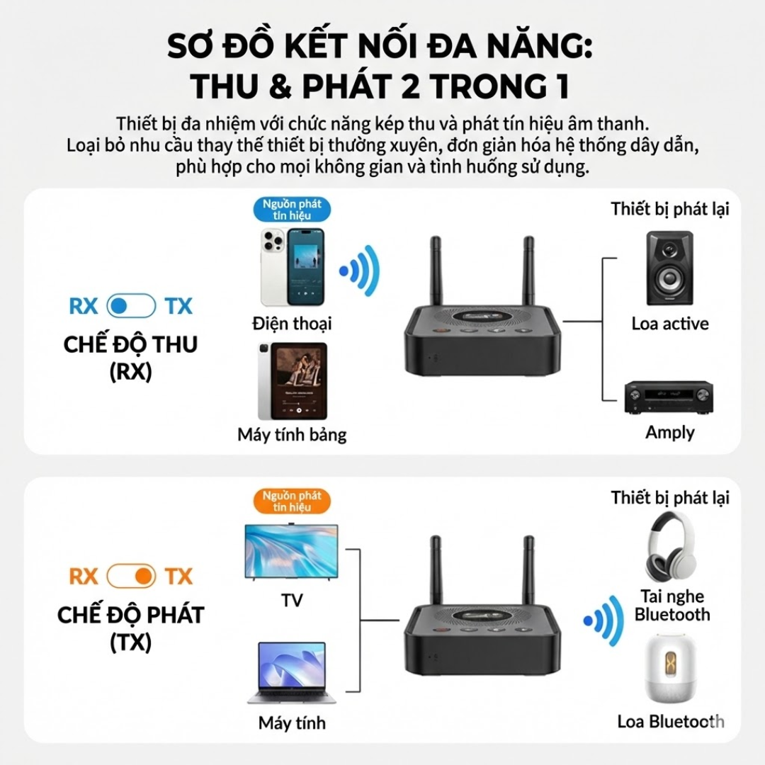 Thu & Phát Bluetooth 2-trong-1 (RX/TX) – chuyển đổi nhanh bằng công tắc